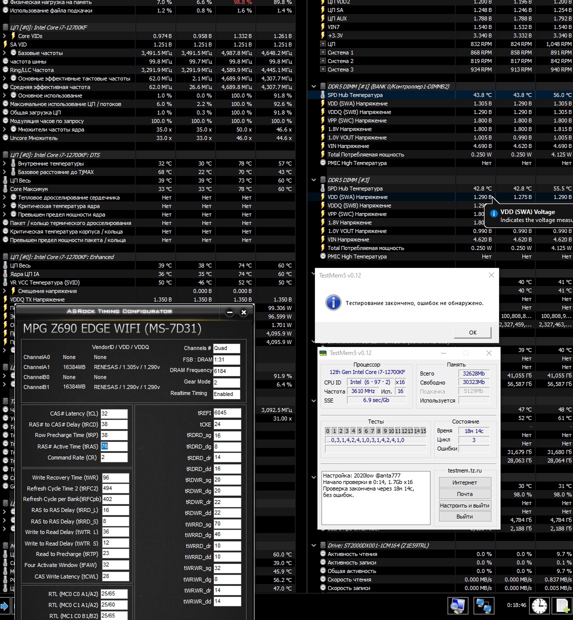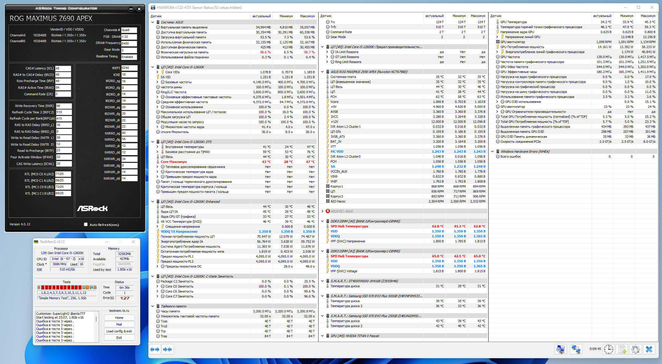 В итоге что-то завели? Я сегодня уже полвечера убил - даже на 1.45В идут ошибки. Я просто не понимаю, отказываюсь верить, что два комплекта на топовых Хайникс (6400 и 6000) не могут сраные 6200 с 32-40-40-56. RTL дикие, по 70-69. Причём как их снизить, непонятно от слова вообще. Несколько раз удачно забутился на 61-62 даже, но потом опять на 69-70 перескочило. Вольтажи абсолютно непонятно как влияют, в один день можно "на отвали" запуститься, в другой вообще половину в дефолт сбросить и всё равно ловить ошибки. Причём я не нахожу даже никакой системы в этом, тупо даже с одними первичками проблемно что-то выжать. Неужели такая "дубовая" плата?
