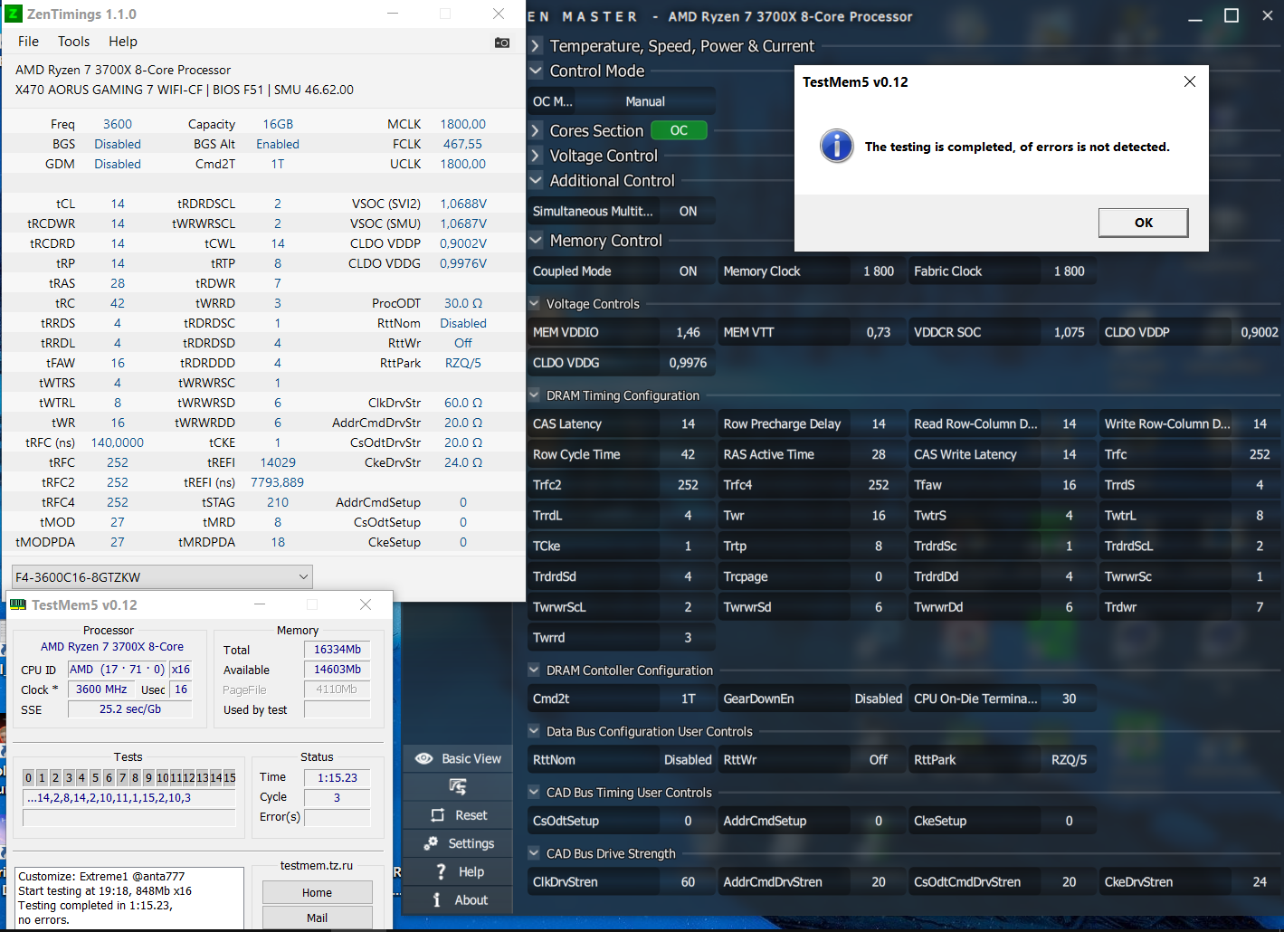 В чем суть дела: Хочу частоту 3466. Изучив даташиты матери понял, что ей это по зубам. При установке данной частоты память не крашиться, все, но ошибки в MT5 есть и их много. Играл с таймингами, с CAD_BUS, играл с напряжением / частотой но так и не добился того, чего желал. Минимальное количество ошибок методом перебора таймингов: одна минута в МТ5 с пресетом Basic: 14 ошибок. В данный момент стабильно работает вот так: