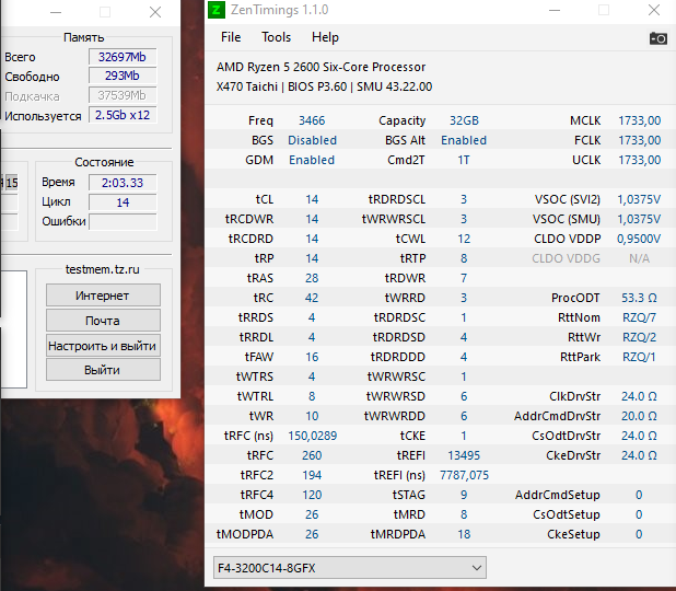 Попробуйте VSOC покрутить и tRFC немного выше сделать. Зачем 2-х часовой тест, надеюсь с активным охладом плашек вы его делаете?)