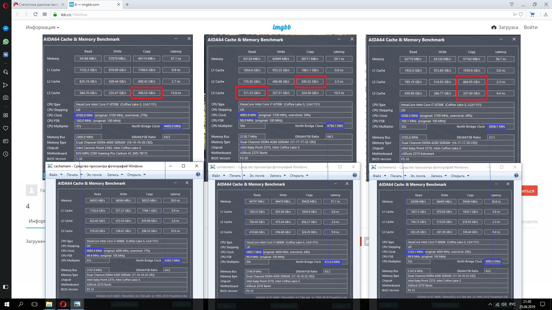 вот это может не 30 но всё же разница ощутимая ,у некоторых разница доходит до 100Gb/s если посмотреть скринов по больше ,красным выделил где должно быть больше а с повышением частоты проца, кэш тоже должен работать производительнее и сравниваем чтение и копирование #77