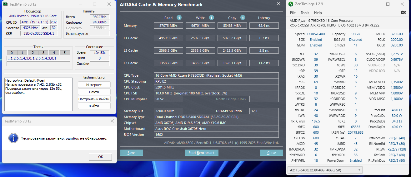 фабрика 2067 и память 6000CL30 были так же или хуже чем память 3000CL30 и фабрика 2000. Хотя пропускная способность по тестам становится выше, прироста по тестам типа xmrig pyprime 2.0 нет...