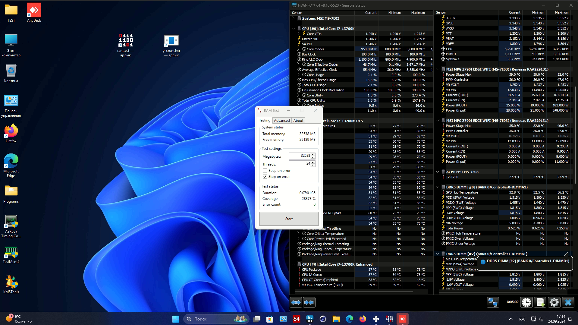 Парни, привет! Кто может помочь? Такая проблема, начну по порядку. Конфиг: Intel Core i5-13600K, MSI MPG Z690 Force Wi-Fi, сейчас новая память DDR5 Team Group T-Create Expert 6400 MHz (c XMP) 16 GBx2 (чипы Hynix A-die), была до недавнего времени память TeamGroup T-Force Vulkan CL32 Hynix 5600MHz 16 GBx2 (чипы Hynix M-die), один модуль которой перестал определяться во всех слотах материнки через год работы, поэтому решил заменить на новую. Но фишка в том, что при ее установки и активации 2-х профилей: как более быстрого XMP 3.0 c частотой 6400 MHz, так и чуть медленного EXPO с частотой 6000 MHz, возникают ошибки в утилите TestMem5, см. на скриншоте ниже, и вылетают приложения. Но если оставляю в стоке без активации профилей, то все в порядке. В чем может быть причина? Ведь материнка согласно спецификации поддерживает до 6666 MHz, тем более, что я прошил на ней BIOS на самый свежий от 21.08.2024 г. #77