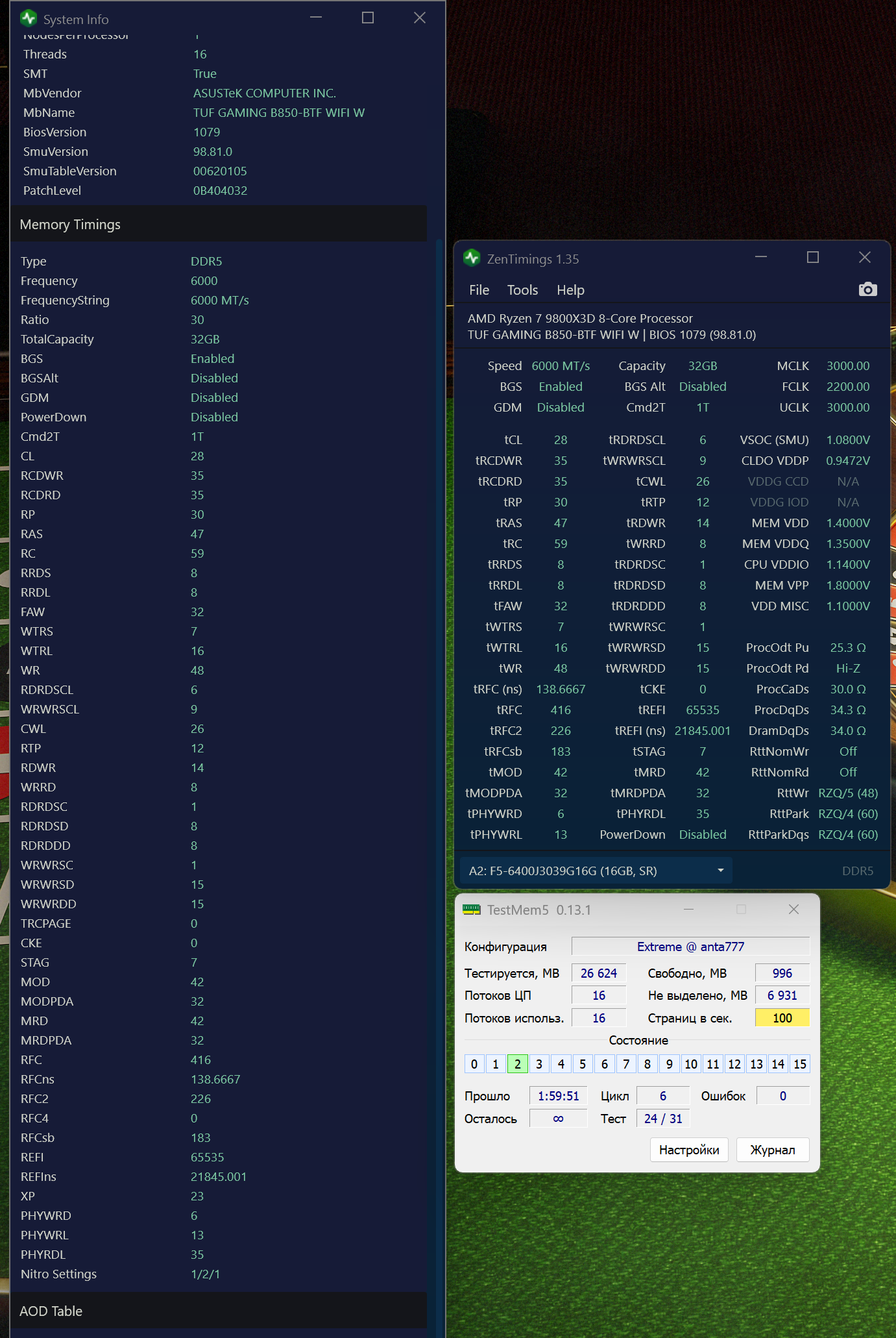 В итоге, проведя тесты в аиде, пришел к выводу, что от 6400 толку особого нет на фоне 6000 и больше всего у меня на ПСП повлиял FCLK до 2200MHz(как я понял, из-за одного чиплета). Разница в тестах только при записи в пользу 6400 (93.3к vs 95.8k MB/s), а чтение и копирование +- одинаковы. В копилку с плюсами использовать 6000: не надо держать высокое напряжение на SOC, пока что понизил до 1.08V, в tm5 с extreme и ryzen3d профилями проходит 2 часа тестов, и значительно упали температуры SOC хотспот и средний. У меня к знатокам 3 вопроса : 1) Насколько верны мои рассуждения насчет 6000vs6400 и большее влияние FCLK на ПСП? 2) Как я понял, единственное последствие от отказа синхронизации 2FCLK/3MCLK - это повышенные задержки, есть мб еще какие-то последствия? 3) На 6000 я дошел пока что до таких таймингов. Можете подсказать, в сторону уменьшения каких таймингов дальше смотреть? Кроме таймингов: удалось понизить VDDQ до 1.35V, заюзал нитро 1/2/1, выключил GDM, PowerDown и Memory Context Restore. Заранее спасибо за помощь