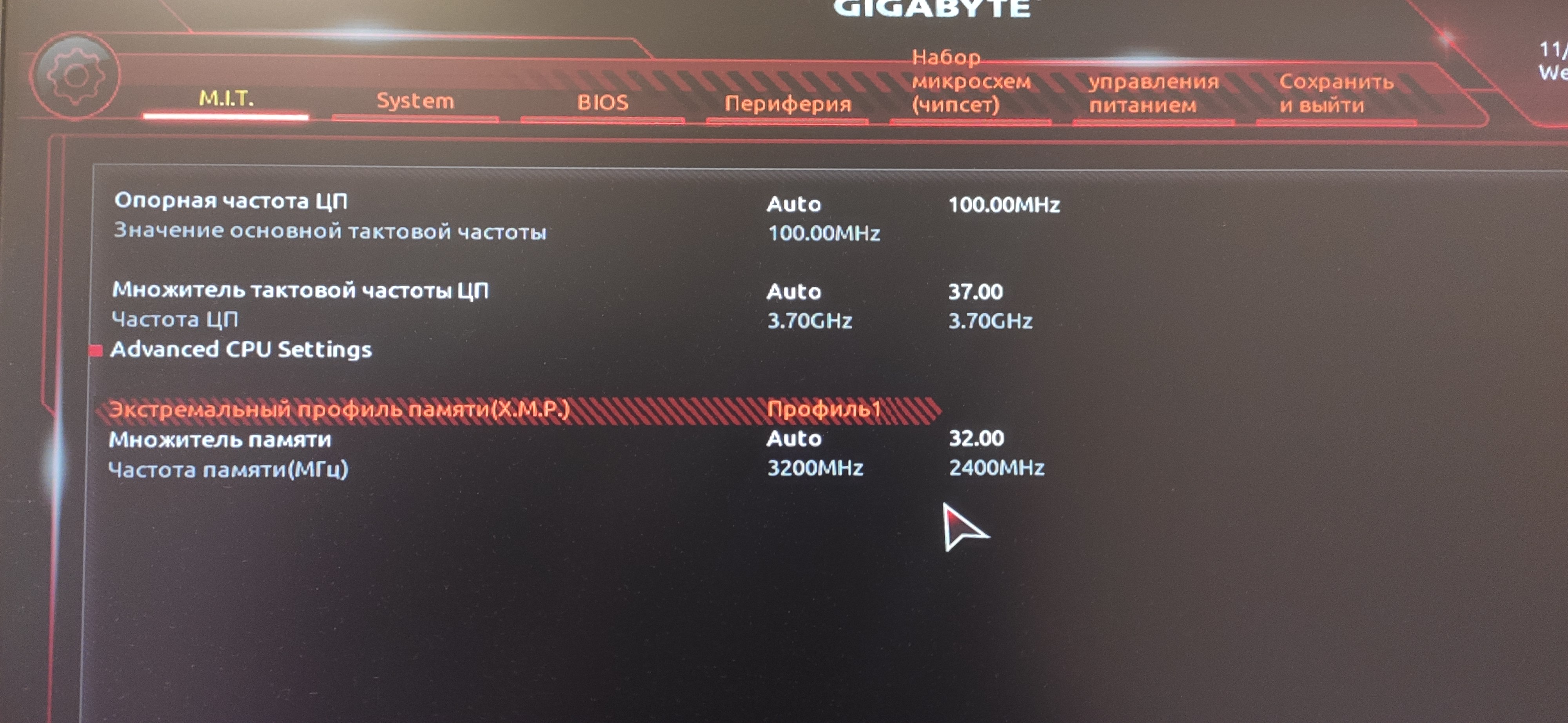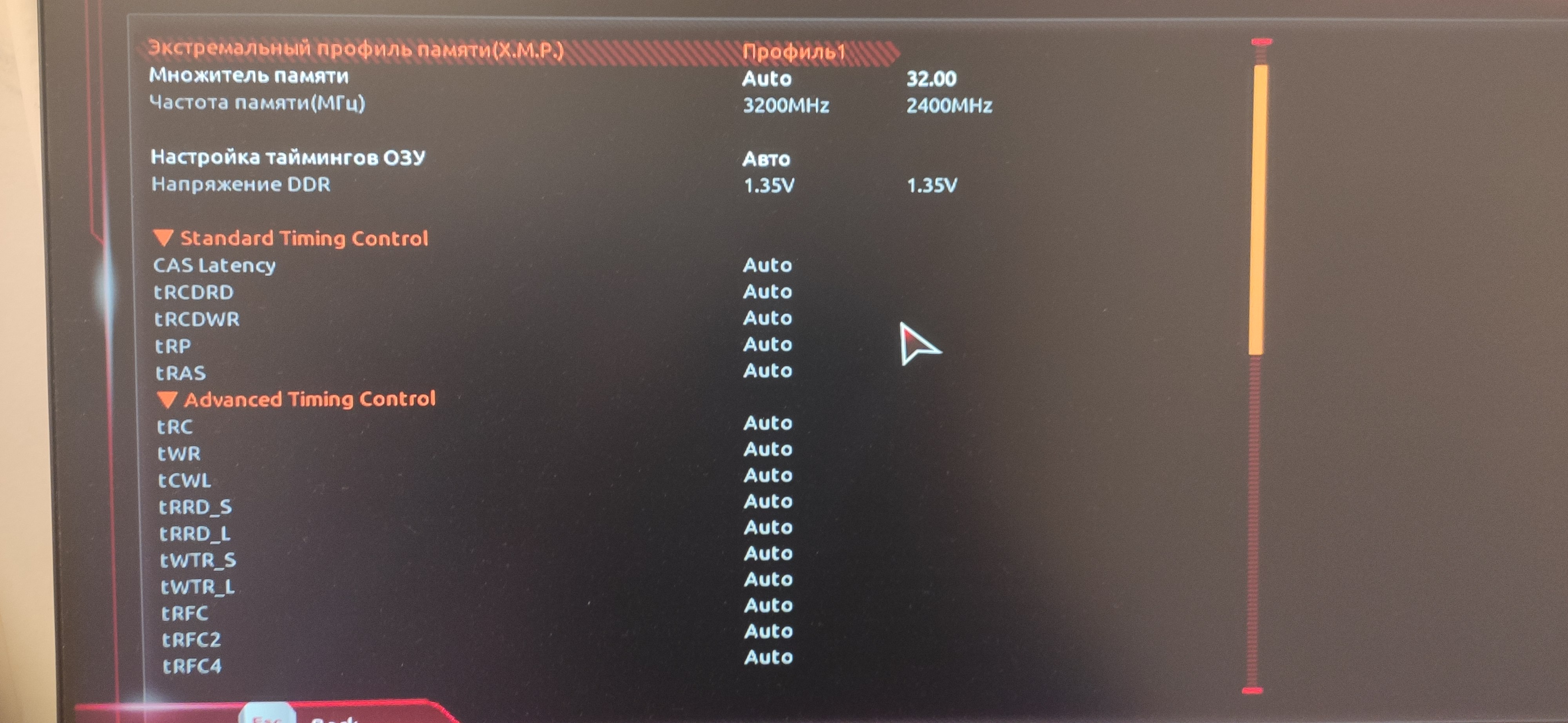 Я установил два модуля памяти Kingston HyperX Fury hx432c16fb3/16 (16 Мб + 16 Мб) на материнскую плату GIGABYTE B450M DS3H (1.0) с процессором AMD Ryzen 7 2700X. По умолчанию модули памяти заработали на частоте 2400 МГц. Тайминги АВТО. При выборе XMP Профайл 1 (3200 МГц, 1.35 В, тайминги АВТО) компьютер не загружается, в БИОС войти нельзя. Как настроить БИОС, чтобы модули памяти запускались на частоте 3200 МГц?