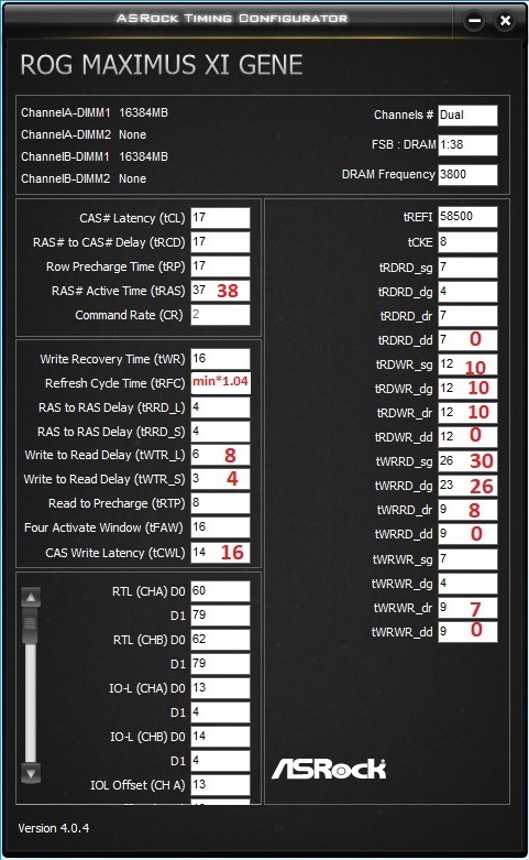 Начните с RCD, CL. Не обязательно должны быть одинаковыми, обычно CL идёт меньше чем RCD. RAS сразу пробуйте как RCD+CL+4, до этого значения от него существенная разница, дальше меньше. CWL<=CL. Допустимые значения 9,10,11,12,14,16,18,20. RP можете выставить по RCD, если пойдёт меньше - тоже неплохо, не уверен правда насчёт смысла. RTP без формул. Если не идёт вниз можно попробовать поднять чуть чуть RP. В DDR4 явно связан с WR соотношением 2 к 1 (например WR20\RTP10), физически хранится одно значения и в зависимости от операции интерпретируется. Скрутите FAW до 16(так и оставьте если работает). С таким FAW скручивайте RRD(оба, L обычно больше чем S), возможно поедут на 4 оба. Если до 4 не удалось спустить поднимите FAW до уровня RRDL*4 и попробуйте ещё, хотя это скорее всего уже почти предел. Обычно L>=S. L - SG(Same Group). S - DG(Different Group) Напр. RRD_L>=RRD_S. CKE=5 СCDL>=4 RDRD_DD и прочие подобные можно проигнорировать если у вас нет двух планок на один канал (4 планки). DD-Different Dimm. Тоже самое с DR-Different Rank если у вас одноранговая память. RDWR_SG(DG) и подобные сочетания скручивайте до минимальных рабочих, потом накиньте сверху +2. Как уже отметил обычно SG>=DG. WTR не трогайте он сам спустится когда будете скидывать WRRD_SG(DG) и прочие подобные. Если сам меньше не стал тогда руками скидывать. WR снижать через WRPRE если есть. Если нет или не снижает WR, То скрутите его скажем до 12 или +4 от рабочего, потом дожмёте если не лень будет. RFC явных формул нет, крутить после всего списка сверху. Не пытайтесь найти его минимальное значение если не хотите чтобы память начинала сыпать ошибками от любого чиха. найдите пограничное со стабильностью значение и накиньте сверху 20 или сразу 40. Может реагировать на RAS+RP, RRD, FAW, причём в обе стороны (то есть может "сломаться" если задрать названные), а может и не реагировать... REFi больше лучше. Связан с RFC. REFI сколько память "работает" - RFC сколько "отдыхает". Оба тайминга лучше не пытаться найти предельное значение.Заметно реагируют на температуру. Многие тайминги отзываются и на температуру и на напряжение. Поскольку напряжение может как позволить снизить тайминг, так и увеличить температуру, то середину можно искать очень долго, поэтому лучше бы вовремя остановится. Тестируйте тщательно с перезагрузками, сном, холодным стартом. RTL и IOL вам кто-то другой пусть советует как настраивать, от них у меня голова болеть начинает...