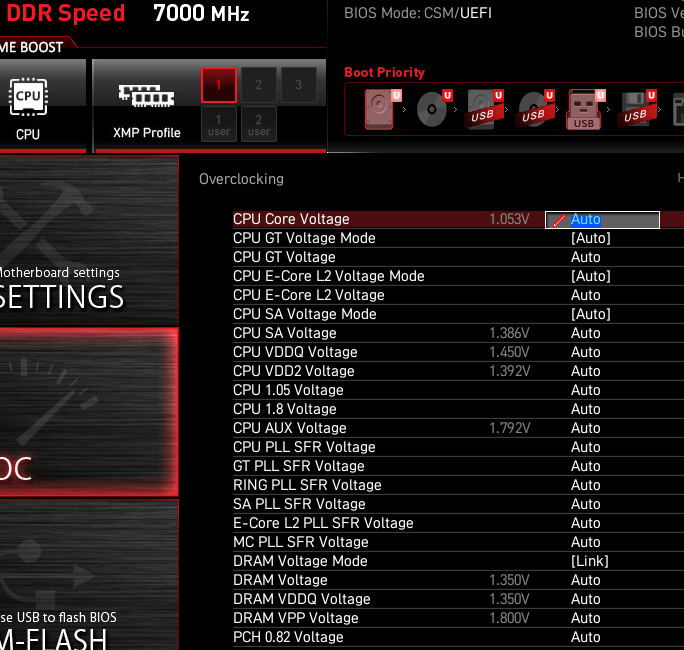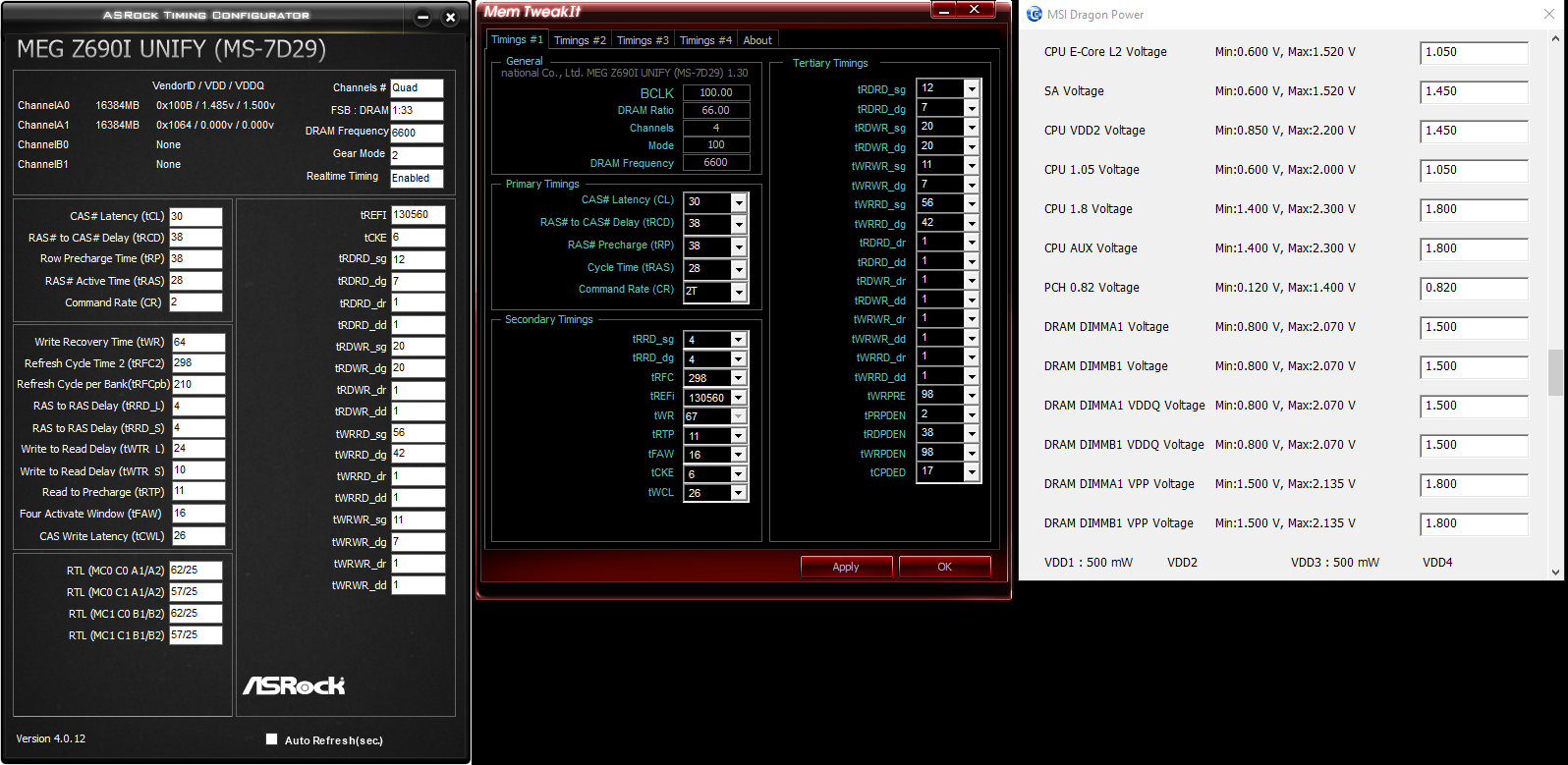 Ничего не крутил: все отдано на откуп плате. В первом случае активировал XMP-6000 и выставил вручную 6800 МГц, во втором - выбрал готовый пресет от MSI = 6600MHz 30CL