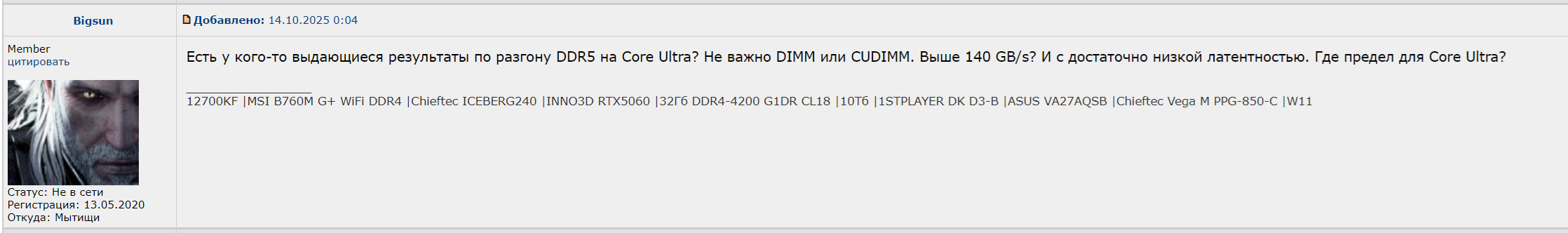Не хуже тебя в курсе. Покажи свой выдающийся результат в соседней теме, тогда поговорим. Тогда и маши своим болтом. Пока что это просто "бла бла бла" и "ты бездарь, а я то вон какой умеющий"... на топовом железе XMP подкрутил - много ума не надо . Давай без оскорблений типа "хлебушков", тут так не принято. Если есть что сказать конкретное - говори. Все остальное - не по делу. И давай закругляться, пиши в ЛС, буду рад поспорить. И научись уже наконец OFFTOP хотя бы за спойлер прятать