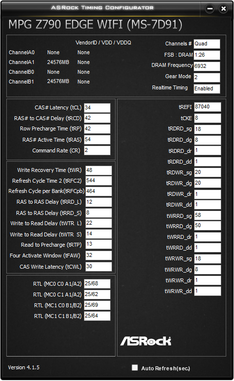 На этой плате память на своей номинальной частоте 7200 МГц не стабилизируется (проверено на других платах – идет до 7600 МГц), поэтому пришлось довольствоваться 6933 МГц и настройкой таймингов. Первички вниз уже не идут, остальные настроил по рекомендациям в теме. tRFC2 также больше не опускается. Но вдруг что-то ещё упустил.