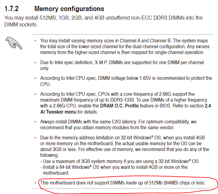 Это вырезка из мануала для Asus P5Q3. Ветка посвящена совместимости Asus P5Q3 с различными планками памяти. Вам нужно зайти на ветку вашей платы MSI H55M-ED55. Посмотрел мануал для вашей платы на офсайтесайте http://ru.msi.com/product/motherboard/s ... own-manual там ничего не сказано по поводу ограничения объема чипов памяти (см. вложение 1). Однако для похожей платы на таком же чипсете Р55 и таком же формфакторе mATX: ASUS P7P55-M ограничения по размерам чипов уже в два раза выше: до 512 Мб (см.вложение 2). http://www.asus.com/ru/Motherboards/P7P55M/ Возможно, поэтому на вашей плате некоторые планки памяти с чипами 512 Мб стартуют, но максимум, чтобы загрузить БИОС. Поскольку в мануале для вашей платы информации по размерам чипов нет, то не вижу варианта, как подождать неделю ответа на английском языке от службы поддержки и воспользоваться онлайн-переводчиком.