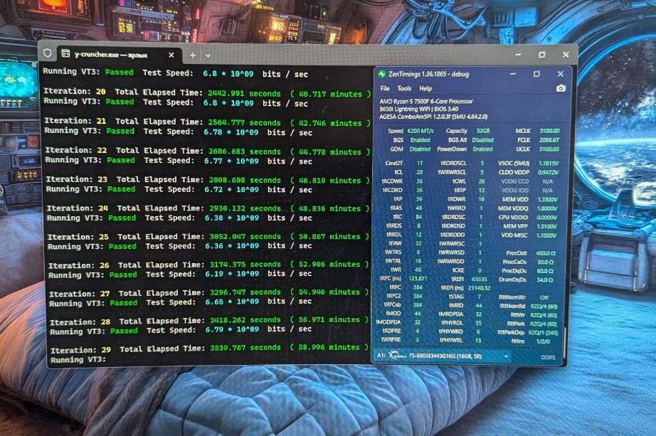 Всем привет. Хотел спросить. У меня 9950x3d, ROG STRIX X870E-E GAMING WIFI, G.Skill 6800MHz Trident Z5 RGB 2x48 ГБ F5-6800J3446F48GX2-TZ5RK. В режиме 6400 все тесты провал, какие бы тайминги и настройки не ставил. На 6200 тесты проходит без ошибок. Стоит ли пытаться заставить 6400 работать или сконцентрироваться на 6200? Что ещё в текущем варианте можно подкрутить? Цели выжать максимум нет. Просто найти стабильный вариант с хорошей скоростью, не тратя на тесты неделю.
