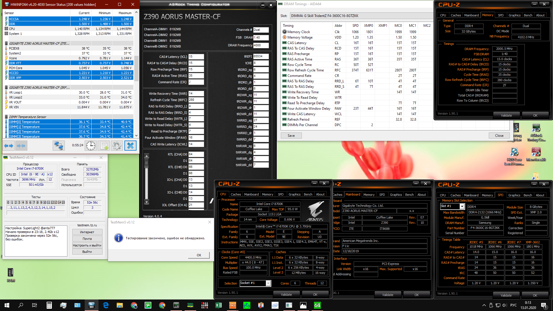 ребята помогите погнать память, crucial ballistix sport 3000 xmp 2ух ранк 2х16гб микрон е-дай. Остальные железки в подписи, проблема в том что все что выше хмр профиля не проходит тесты, вчера ставил 3200mhz cr2 16-18-18-38 1.35v субтайминги на авто, прошло мемтест86 20 часов 13 проходов, линпак 10 проходов, но тестмем5 с профилем экстрим от анта777 завалило, через 30 минут теста выскочила ошибка, проьовал и вольтаж 1.45 ставить и тайминги 18-20-20-40 не проходит тесты, читал статьи, пробовал по райзен калькулятору субтайминги крутить, ничего не выходит сыпит ошибки и хоть ты лопни. Читал статьи, половину не понимаю вообще о чем идет речь, мне бы хоть ее погнать до 3200 mhz. Слышал что возможно контроллер памяти в процессоре выше 3200 не хочет на kaby lake, может кто гнал память на таком проце?