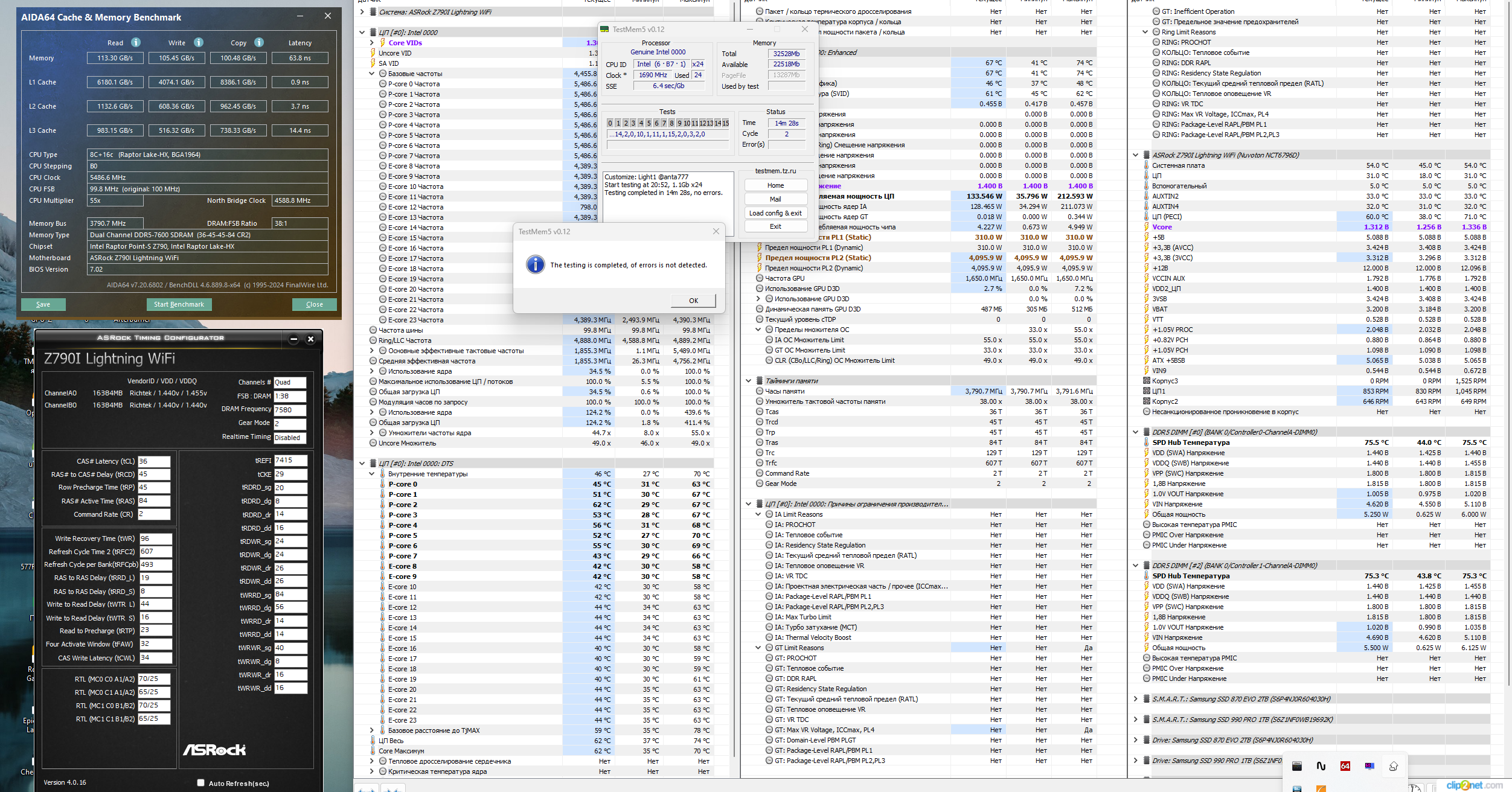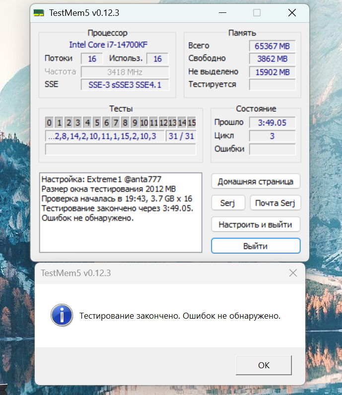 Ну наконец-то тест пройден. Дело было в багованной памяти! а не в процце! Можно было не менять проц). CTCED564G6400HC34BDC01 24 год 45 неделя SK hynix. Какие именно ХЗ. тупо по хмп на 6400 и нет проблем. Гнать не пробовал! В стресс тесте на 3 часа максимум память нагрелась до 60 градусов без обдува. Хорошие радиаторы. ЗЫ. Доволен как слон. Хотя бюджет увеличения с 32 до 64 рам был 10к а получился 40 + ещё для нового процца 14700кф надо летом будет брать водянку или кондей в комнату ))) + Надо будет с таймингами пошаманить ) Спасибо за подсказки!