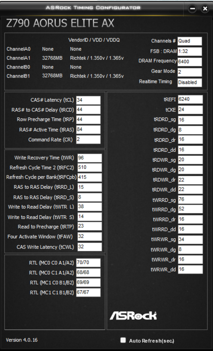 EXtended Profiles for Overclocking v1.0: Скорость памяти DDR5-6400 (3200 МГц) Напряжение питания (VDD) 1.35 V Напряжение питания (VDDQ) 1.35 V Напряжение питания (VPP) 1.80 V Рекомендуется DIMM на канал 1 Тайминги памяти 34-44-44-84 (CL-RCD-RP-RAS) / 128-946-513-417-97 (RC-RFC1-RFC2-RFCSB-WR) CAS To CAS Delay (tCCD) Same Bank Group: 17T RAS To RAS Delay (tRRD) Same Bank Group: 17T Write To Read Delay (tWTR) Same Bank Group: 33T, Diff. Bank Group: 9T Read To Precharge Delay (tRTP) 25T Four Activate Window Delay (tFAW) 33T Write CAS To CAS Delay (tCCDW) Same Bank Group: 65T