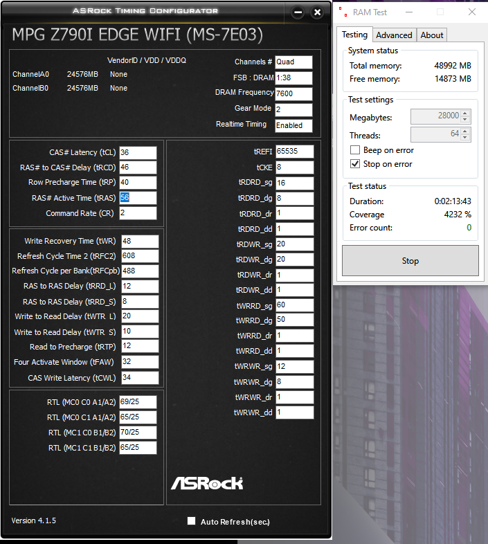 Вчера было для меня откровением прочитал на форуме DNS, что мою память и не надо было гнать, особо по вольтажу DDR VDD и DDR VDDQ до 1.50-1.40В, J-SkaR пишет и да, у него Апекс - Сейчас едем 8000 cl40: vdd=1,35, vddq=1,35, MC=1,4, vddq TX=1,35, SA=1,16, по сути память у него работает на стоке, я сам сегодня по пробовал опустить вольтаж и нашел новые В для DDR VDD и DDR VDDQ, первичные тайминги CL у меня на 36 по этому вольтаж вышел не много другим, но все равно, на 1В от первых настроек уронил вольтаж, теперь и память греться меньше будет, DDR VDD было 1.49,5 - стало 1.39,5 (сток 1.35В), DDR VDDQ было 1.40В стало 1.370 В, успел поймать стаб на 7600, 7800 в процессе, в 8000 на стаб не рассчитываю, но все равно на родных первичка CL 40-48-48-128 по пробую с подъемом вольтажа , здесь вопрос: вольтаж DDR VDD поднимать параллельной с VDD2? То есть по одному вольту там и там накидываю и так до 1.5В ползу вверх, пытаюсь 8000 запустить, так правильно буду проводить настройку?