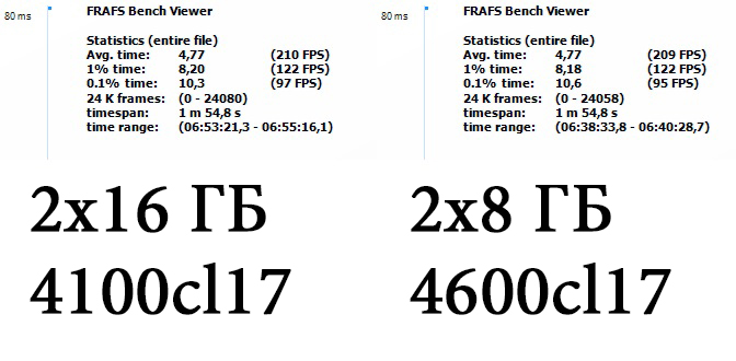 Олег, а можно тебя попросить взять 4х8 (хотя те же Flare X , которых у тебя 4) и сделать тот же тест? Ей-Богу, сдаётся мне что на 4100CL17 эти 4х8 будут как дуалы по FPS, а если пойдут на шаг-два выше (что в твоих руках весьма вероятно, плюс остальные компоненты позволяют) - втопчут в грязь и 2х16 и 2х8... По поводу 2х16 всё так и есть, но для отборного B-die, CJR увы не так хорошо масштабируется (ну либо из него рекорды доставать надо).