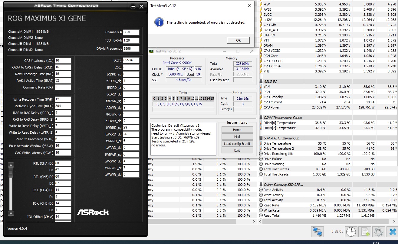 Моя память испугалась, что изменю ей с другой и поехала 16-16-16-3866) DRAM =1,397V, VCCIO - 1,232V, VSSA - 1,248V. Причем ранее на более высоких DRAM V, VCCIO V ехать не хотела. Где то что то в биос нажал)