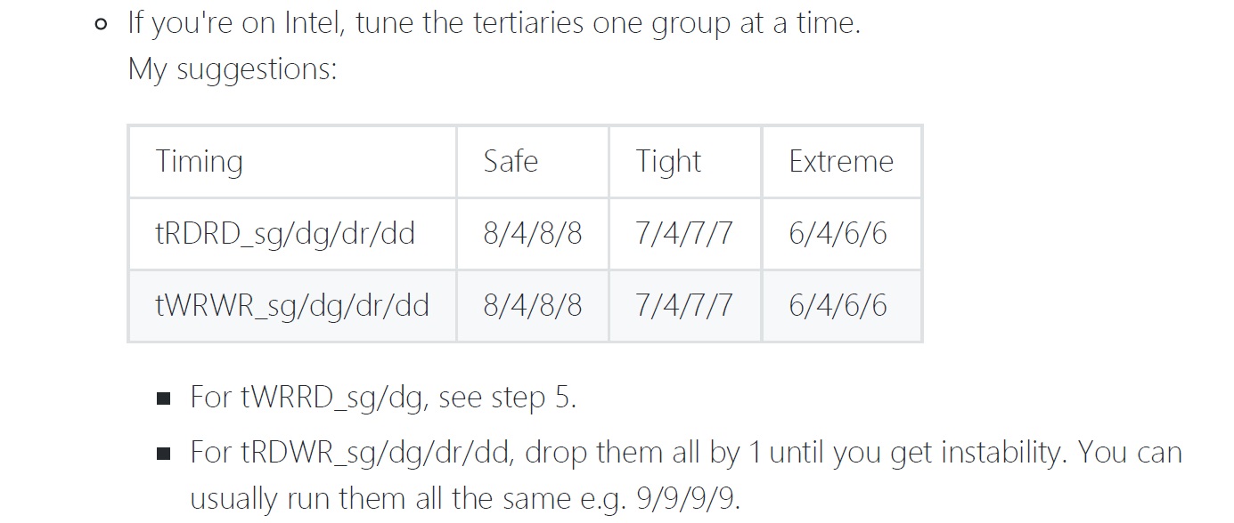 Начните с RCD, CL. Не обязательно должны быть одинаковыми, обычно CL идёт меньше чем RCD. RAS сразу пробуйте как RCD+CL+4, до этого значения от него существенная разница, дальше меньше. CWL<=CL. Допустимые значения 9,10,11,12,14,16,18,20. RP можете выставить по RCD, если пойдёт меньше - тоже неплохо, не уверен правда насчёт смысла. RTP без формул. Если не идёт вниз можно попробовать поднять чуть чуть RP. В DDR4 явно связан с WR соотношением 2 к 1 (например WR20\RTP10), физически хранится одно значения и в зависимости от операции интерпретируется. Скрутите FAW до 16(так и оставьте если работает). С таким FAW скручивайте RRD(оба, L обычно больше чем S), возможно поедут на 4 оба. Если до 4 не удалось спустить поднимите FAW до уровня RRDL*4 и попробуйте ещё, хотя это скорее всего уже почти предел. Обычно L>=S. L - SG(Same Group). S - DG(Different Group) Напр. RRD_L>=RRD_S. CKE=5 СCDL>=4 RDRD_DD и прочие подобные можно проигнорировать если у вас нет двух планок на один канал (4 планки). DD-Different Dimm. Тоже самое с DR-Different Rank если у вас одноранговая память. RDWR_SG(DG) и подобные сочетания скручивайте до минимальных рабочих, потом накиньте сверху +2. Как уже отметил обычно SG>=DG. WTR не трогайте он сам спустится когда будете скидывать WRRD_SG(DG) и прочие подобные. Если сам меньше не стал тогда руками скидывать. WR снижать через WRPRE если есть. Если нет или не снижает WR, То скрутите его скажем до 12 или +4 от рабочего, потом дожмёте если не лень будет. RFC явных формул нет, крутить после всего списка сверху. Не пытайтесь найти его минимальное значение если не хотите чтобы память начинала сыпать ошибками от любого чиха. найдите пограничное со стабильностью значение и накиньте сверху 20 или сразу 40. Может реагировать на RAS+RP, RRD, FAW, причём в обе стороны (то есть может "сломаться" если задрать названные), а может и не реагировать... REFi больше лучше. Связан с RFC. REFI сколько память "работает" - RFC сколько "отдыхает". Оба тайминга лучше не пытаться найти предельное значение.Заметно реагируют на температуру. Многие тайминги отзываются и на температуру и на напряжение. Поскольку напряжение может как позволить снизить тайминг, так и увеличить температуру, то середину можно искать очень долго, поэтому лучше бы вовремя остановится. Тестируйте тщательно с перезагрузками, сном, холодным стартом. RTL и IOL вам кто-то другой пусть советует как настраивать, от них у меня голова болеть начинает...