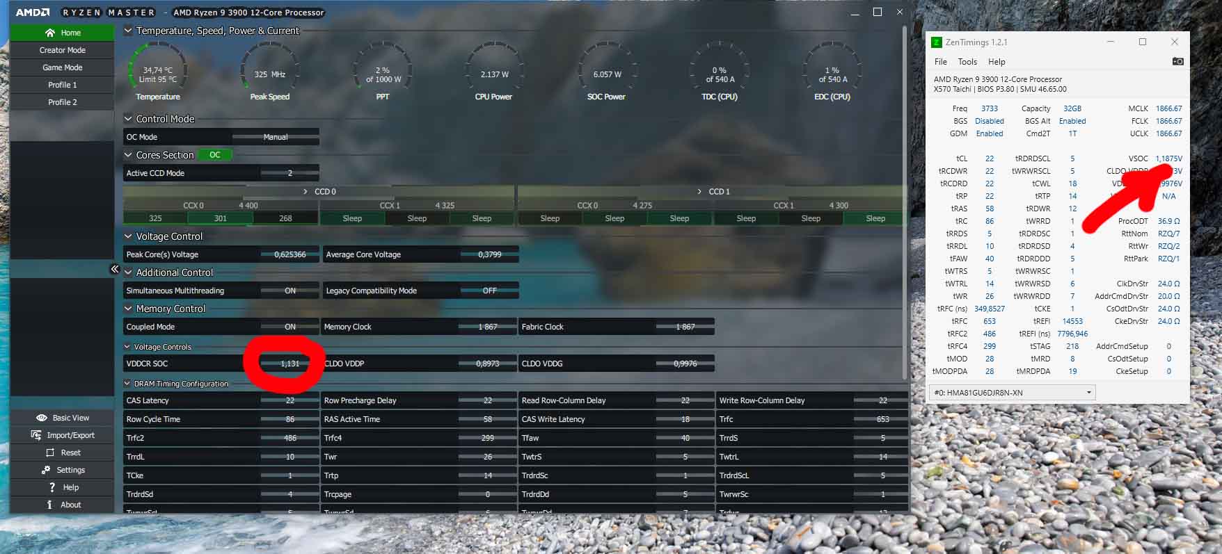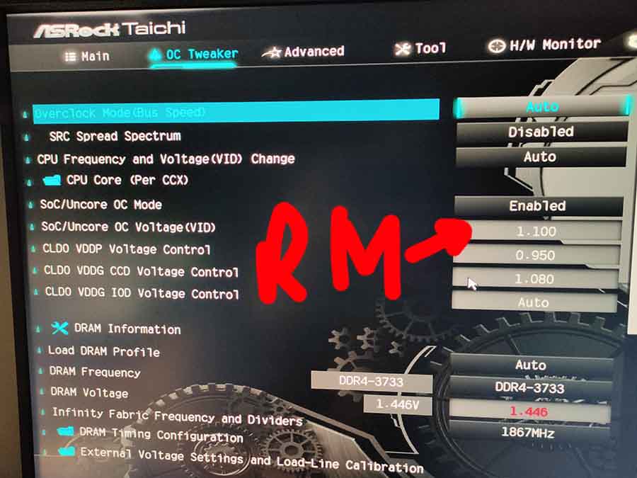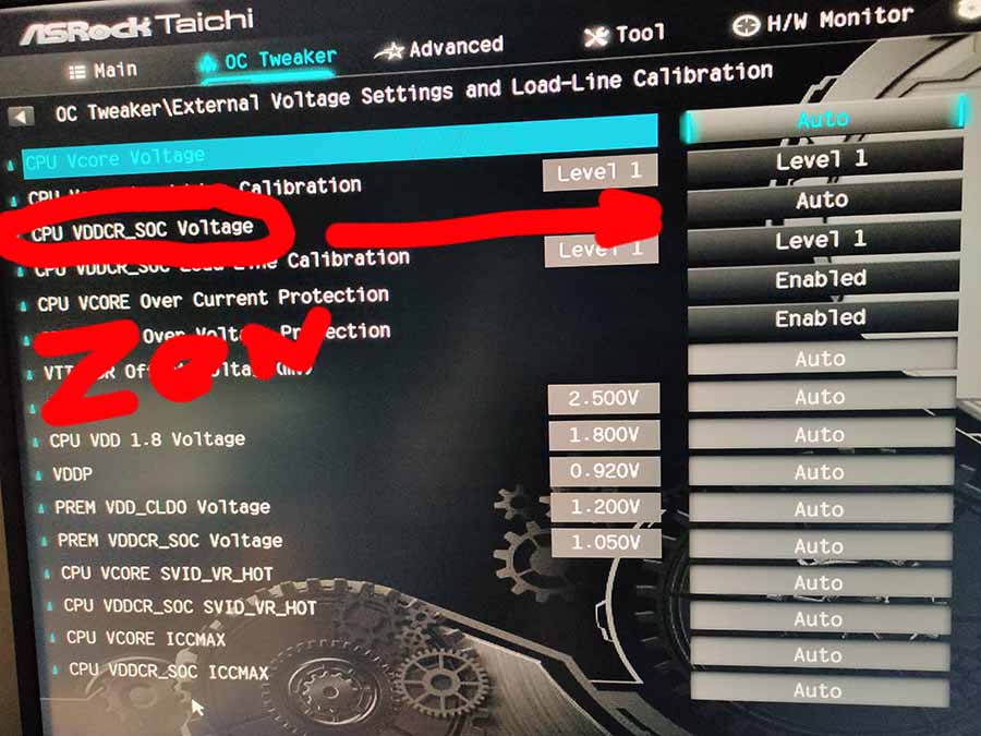 На вкладке H/W Monitor есть VDDCR_SOC Voltage. На X470 тайчи в авто ставит 1,1 ллс 5 (1,08 по мониторингу платы). Поставь на втором скрине вместо авто Fixed Mode и 1,1 В с load-line calibration Level 5.
