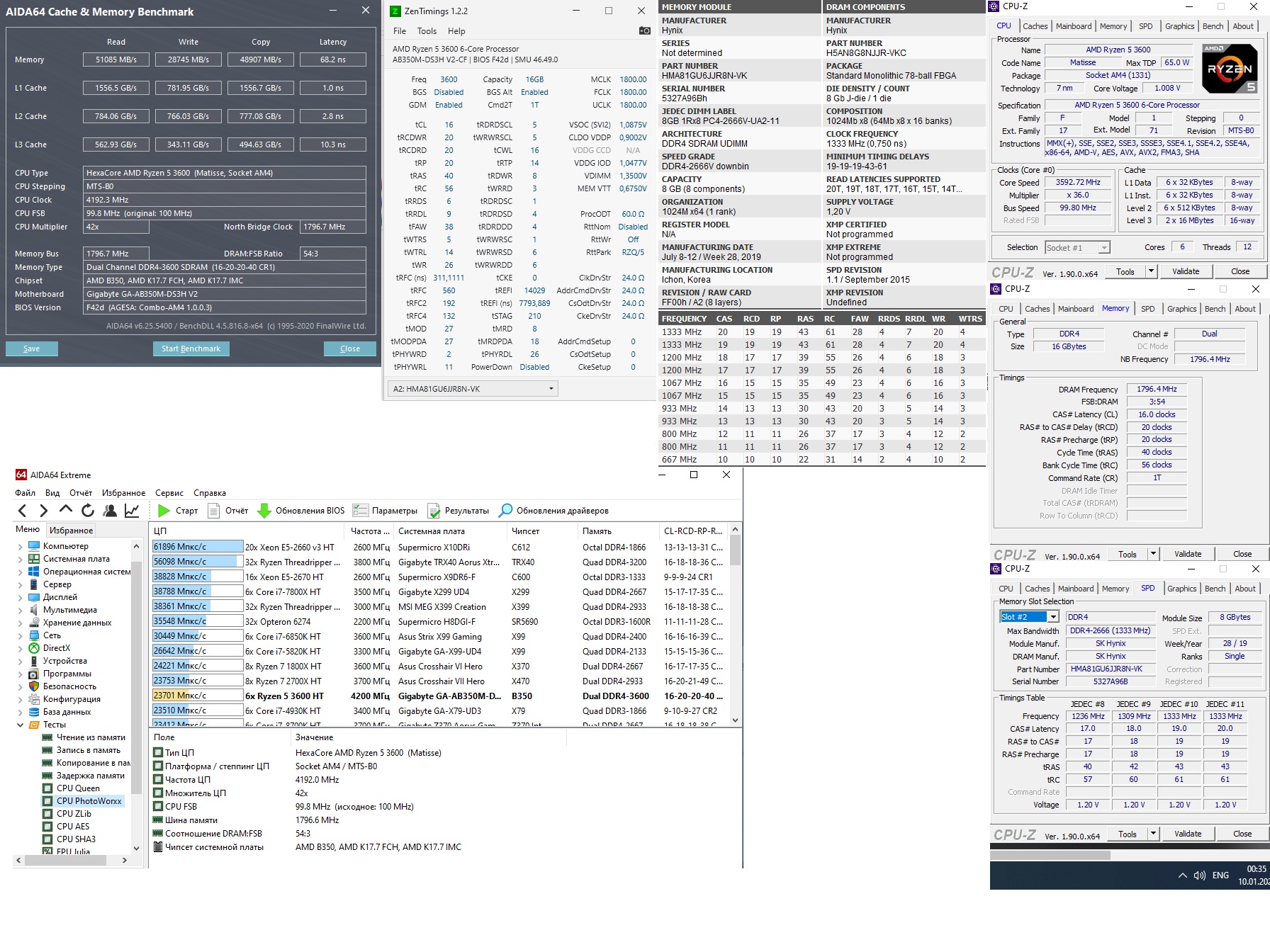 Добрый день! Впервые решился подразогнать память и застрял на определенных показателях - 3600мгц на 19 таймингах система стартует, проходит тест аиды, но в test memory 5 при долгом тесте выбивает 1ну ошибку на 7 тесте. Для настроек вторичных таймингов у меня ума не хватает Помогите пожалуйста ужать тайминги и/или повысить частоту, при этом не повышая напряжение выше 1.35v. ПК: AMD Ryzen 5 3600 GIGABYTE GA-AB350M-DS3H V2 SK Hynix HMA81GU6JJR8N-VK 16gb(те самые, зеленые невзрачные и самые дешевые с частотой 2666мгц) DRAM Voltage 1.35v Hynix J-Die на таком напряжении частота поднялась до 3600мгц, проходит любые тесты, работает стабильно.