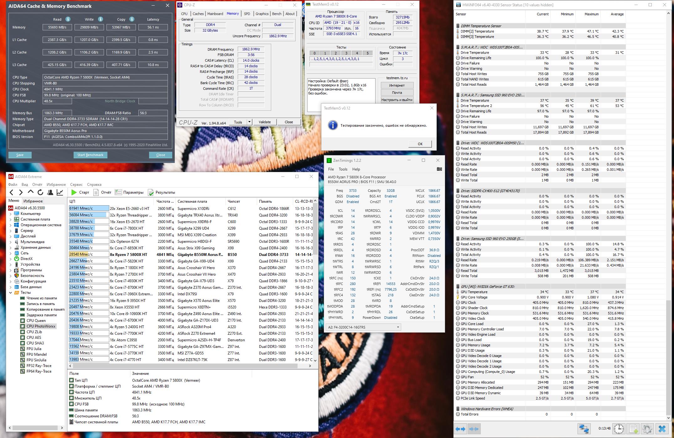 Скрин с аиды во вложении, на тему ошибок в тм5 как-то непонятно. Один прогон ошибок нет, следом второй прогон - пошли ошибки. Возможно надо подождать биос на мою мать с обещанной Agesa 1.1.9. Поставлю пока ХМР профиль.