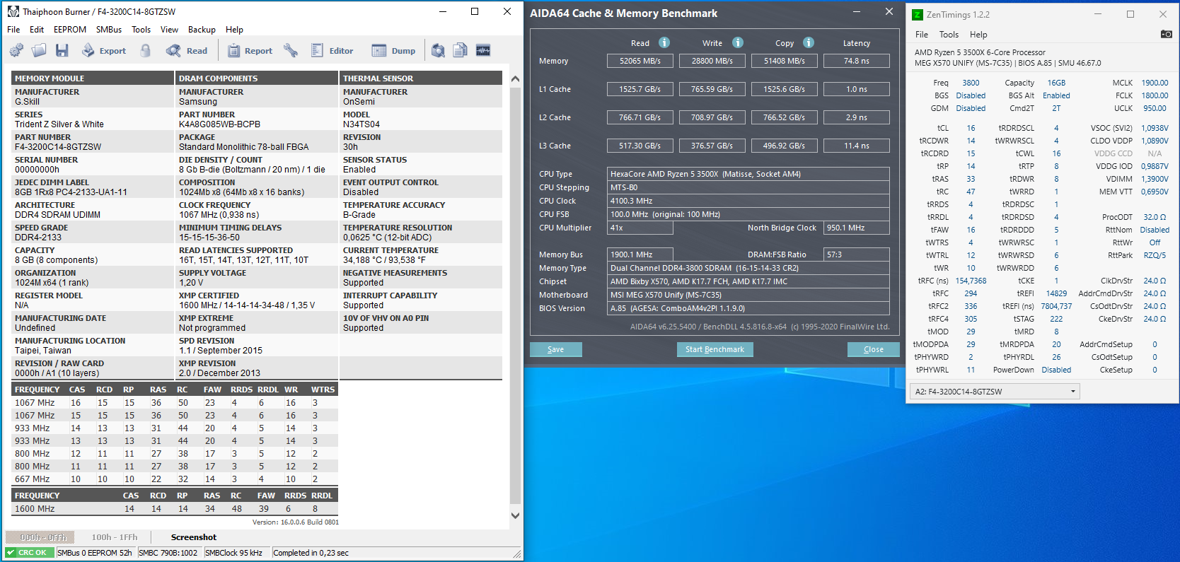 Всем привет. Хэлпаните выжать максимум из того, что есть. Конфиг: MSI X570 Unify, память G.Skill F4-3200C14-8GTZSW 2 плашки по 8 гб. 3500x - временное решение. Чуть позже буду обновлятся на 5800x, когда просядут цены хотя бы до 35 к. и спадёт дефицит. Первоначально тайминги за основу взял от человека из этого поста. https://forums.overclockers.ru/viewtopic.php?p=16628457#p16628457: А вот мои результаты с данными цифрами: