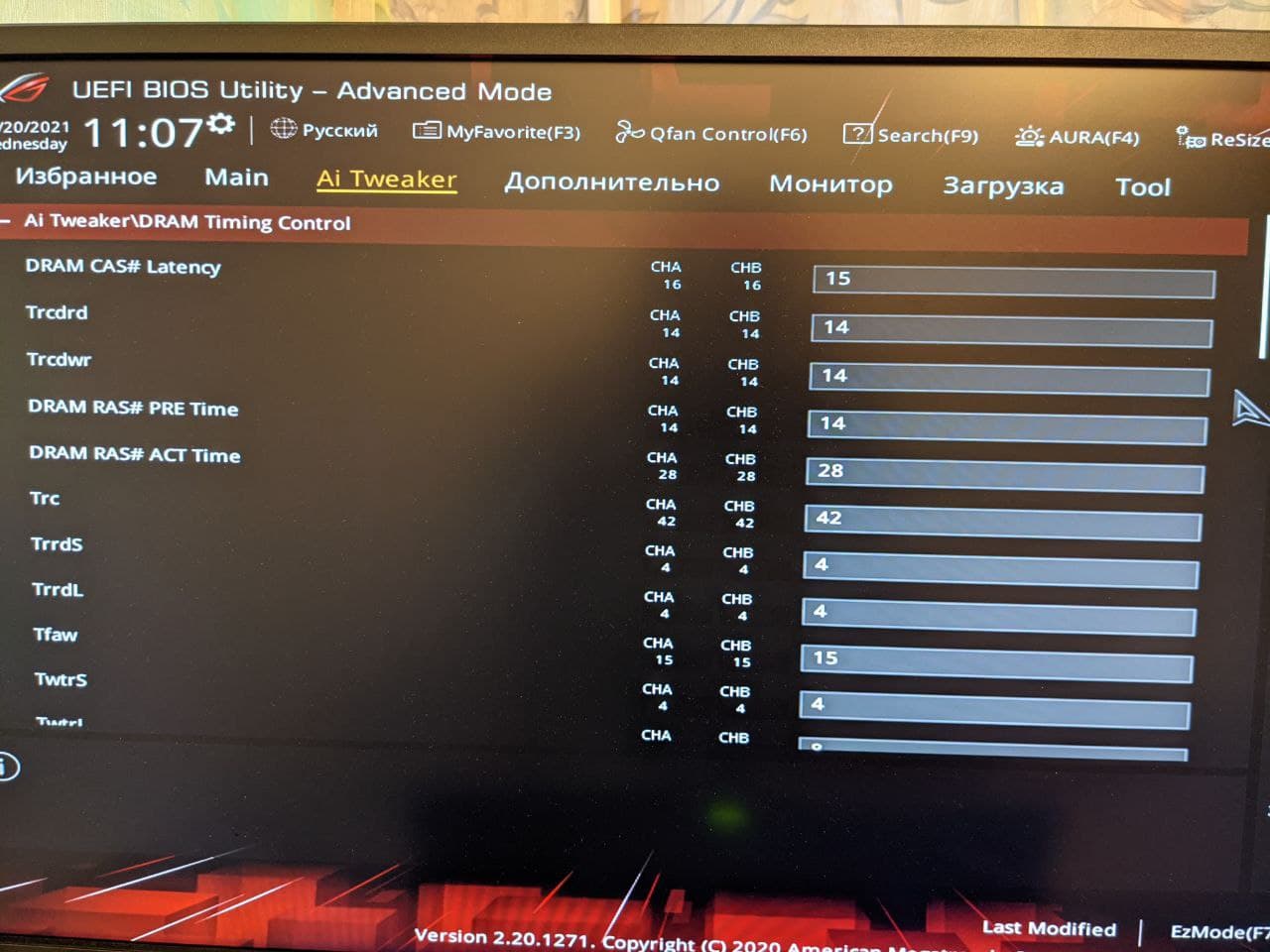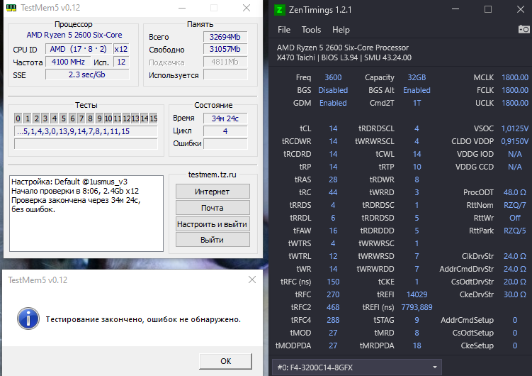 Уважаемые Гуру и Форумчане, добрый день! Прошу, если не трудно, разобраться, помочь в следующем. Мат плата Аsus tuf 450 m plus gaming Проц. Razen 5 2600 (в стоке) Память 2400МГц, Kingston HyperX Fury Black, HX424C15FB/16,Ранк-2 ( чип. nanya NT5AD1024M8A3-GZ) Может дело в этом )))) Удалось разогнать только до 2733 MHz. По крайней мере тест на Testmem 5 ( 25 минут ) прошел без ошибок. При данных настройках тайминг( первичный) минимальный. При понижении идет перезагрузка. DRAM Voltage установлен на уровне 1,43. При понижении ( на -1 ) Testmem 5 на 5-6 цикле выдает 1 ошибку. При активизации RttWr - черный экран. Если не трудно гляньте пожалуйста все ли я корректно выставил. Не будет ли системе от таких настроек плохо!)) Может нужно, что подправить? Так как разгоном занимаюсь впервые, то не исключаю, что мог и напортачить
