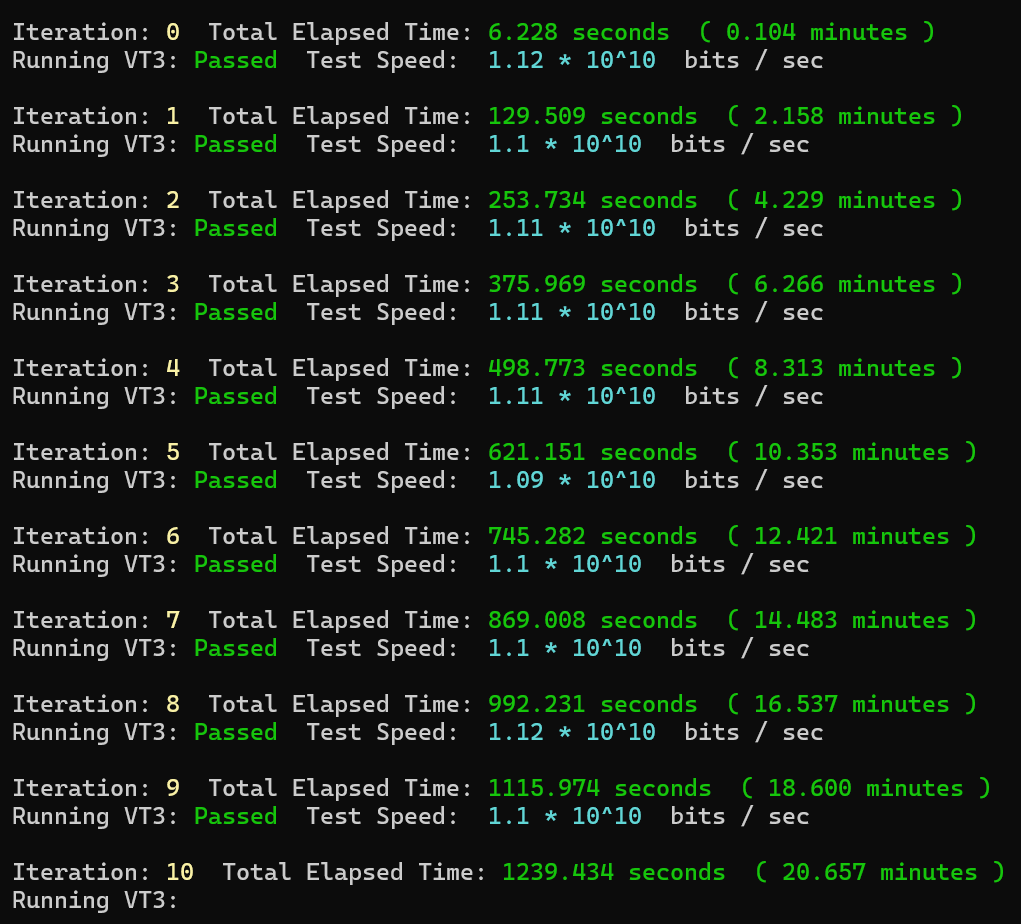 Я сперва жму 2, выходит список тестов и опции. Потом 4 - ввожу секунды. Потом 8 - отключить все тесты, и 18 - включить VT3. По умолчанию 120 секунд на тест, может часа три и более искать ошибку, выставил 300 секунд - через 25 минут нашёл.