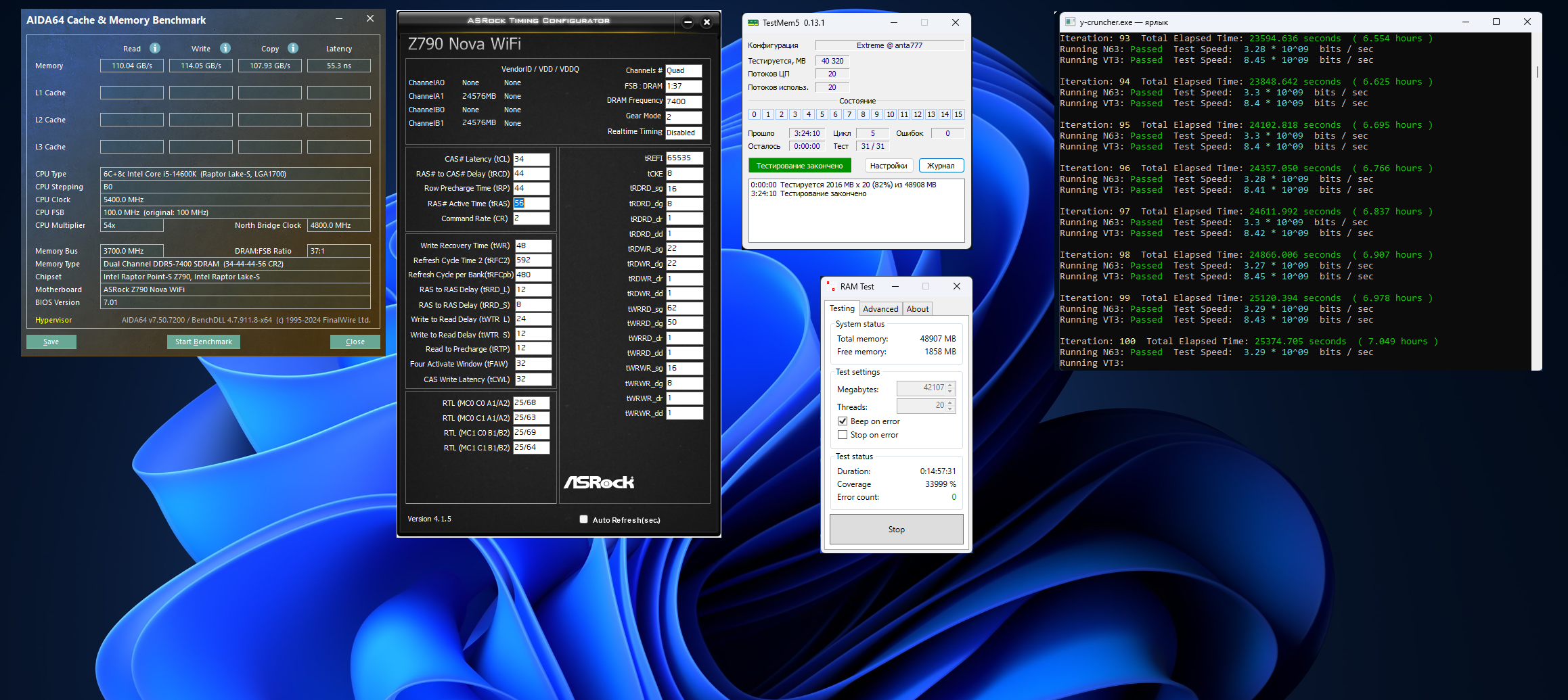 Приветствую. Имею 14700к и з790 томагавк. Щас память Тим Групп цл 30 на 6000. Погнал ее до 7000 34-42-42-42-54 с такими таймингами работает стабильно. 7200 не берет на 1.45в, а выше не делал.