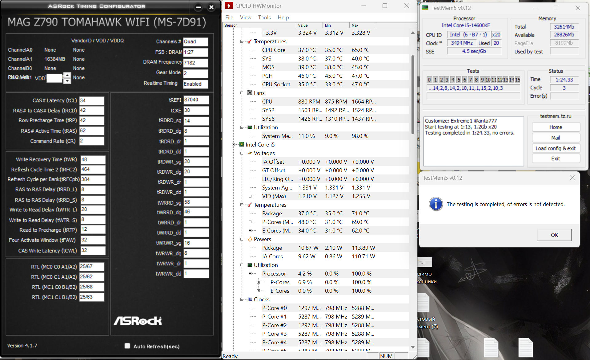 В чём вся боль моя заключается: не могу её заставить работать нормально, если запускаю memtest5 extreme1 anta777 - может пройти 1.5 часа без ошибок, может выкинуть ошибку, не могу понять с чем связано, но заметил если включать OCCT проц+озу экстрим + memtest5 extreme1 anta777, то даже 10 минут не проходит сразу выпадает ошибка.