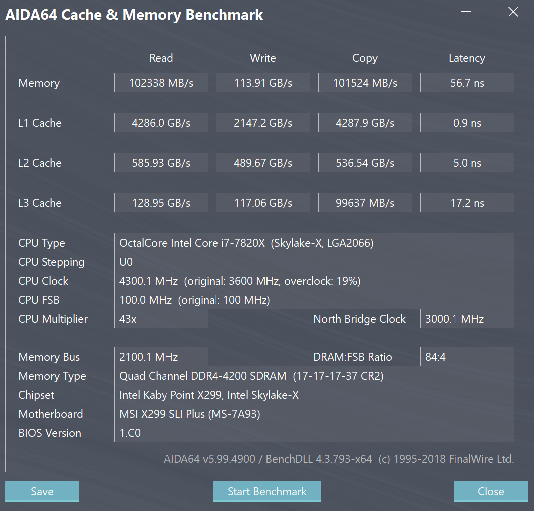 CPU Name: Intel Core i7-7820X @ 4300MHz Motherboard Model: MSI X299 SLI PLUS