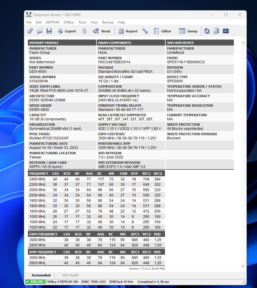 bios_ver смотрю на скриншот из тайфуна, а там почемуто на 5600 тайминги 40 заявлены, а на 6000 38 тайминги. весело. давай все тоже самое только tcl 40, trcdrd 40, trp 40