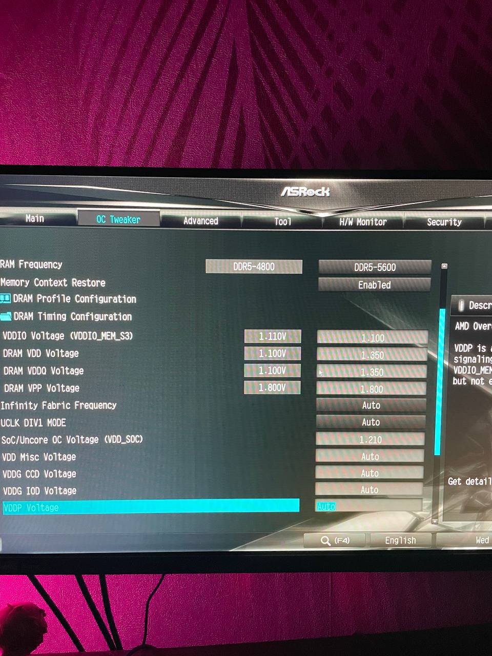 bios_ver Давай тогда еще SOC поднимем. В биос, опять ставь 1.35 на vdd vddq. Ищи пункт VDDCR_SOC Voltage, ставь там fixed, в появившемся окне руками 1.21 вольт. частоту на 5600, tcl 38, trcdrd 38, trp 38