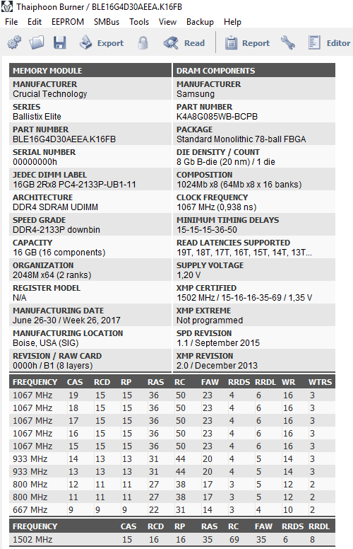 Расшифровка маркировки на примере BL2K8G32C16U4BL: BL - серия BaLlistix; 2K - комплект из 2 планок (если планка продается поштучно, то эта часть отсекается); 8G - объем одного модуля 8 Gb; 32 - частота 3200 Мгц (30 для 3000 Мгц и 36 для 3600 Мгц); C16 - тайминг tCL XMP профиля 16-18-18-36 (для C15 это 15-16-16-35); U4 - ревизия (ранее шла серия AES); B - цвет радиаторов B-black-черный (R-red-красный и W-white-белый); L - наличия RGB подсветки. У модулей без RGB буква в маркировке отсекается. Из плюсов модулей с RGB можно выделить наличие датчиков температуры.