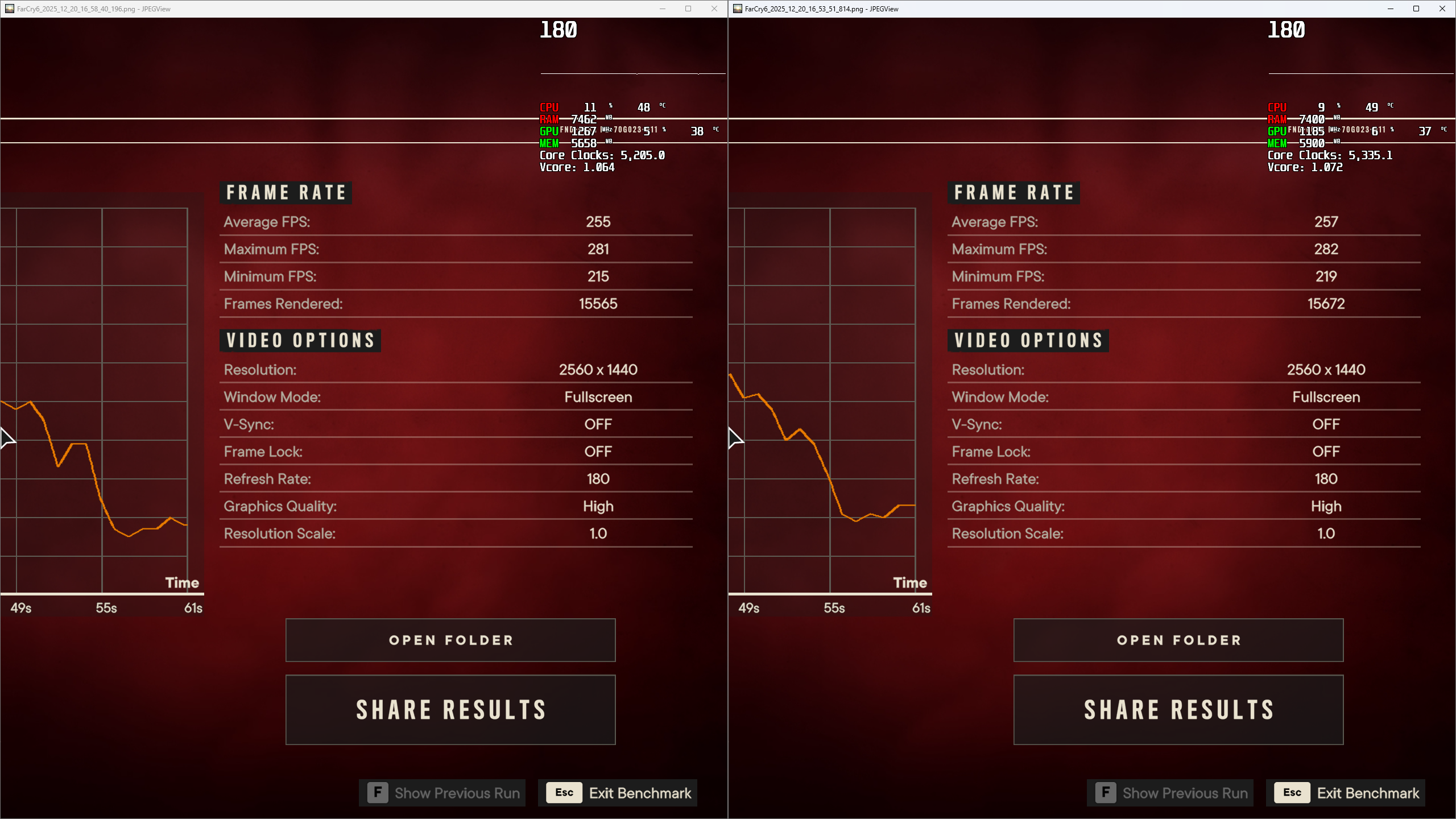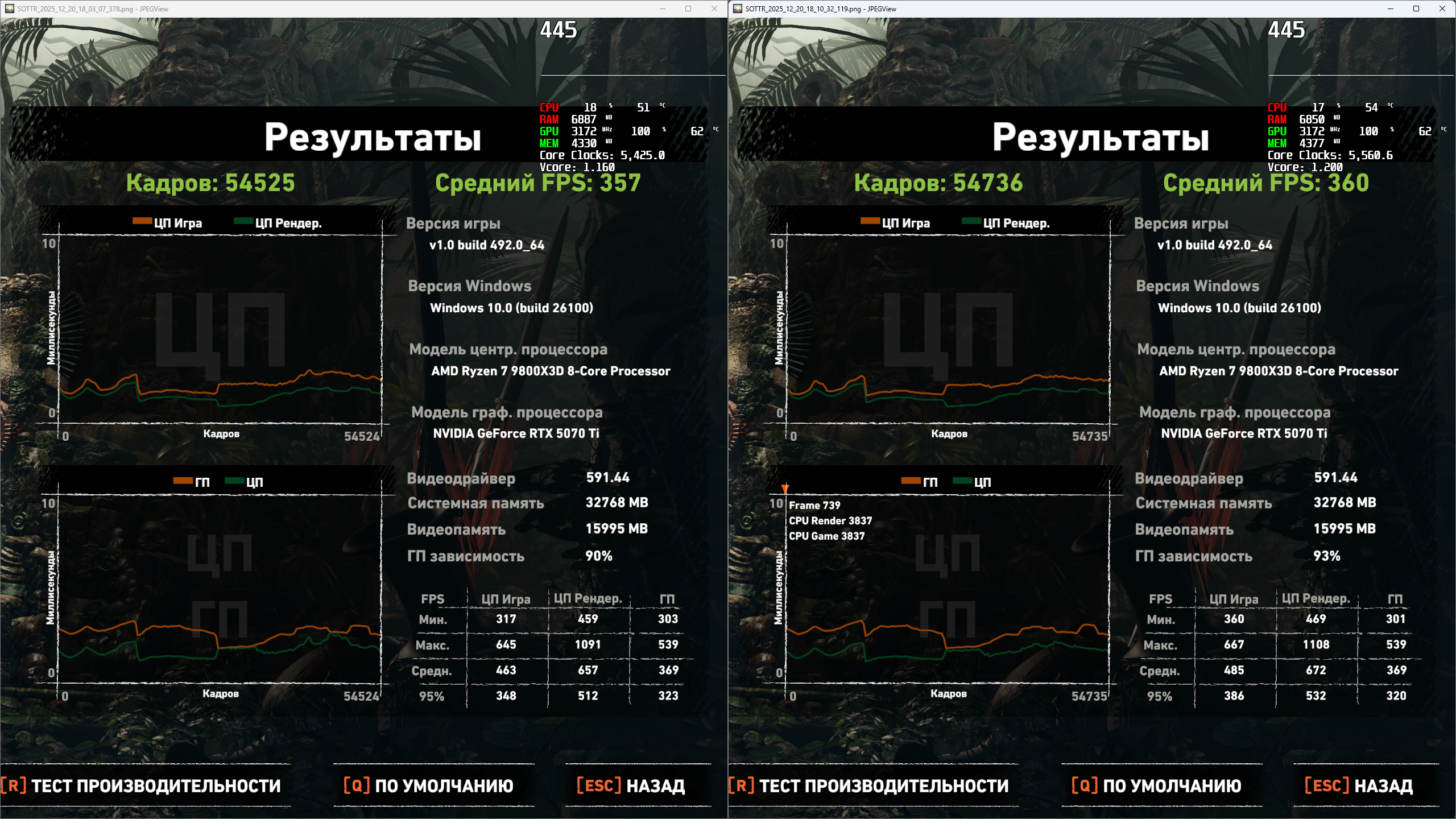 Добавлено спустя 48 минут 55 секунд: От 103.1 bclk отказался в пользу 102.5, на 103 какой то жор невменяемый местами.. Для сравнения прогнал pbo 5425 6000 26 (он слева) и 102.5 - 5560 6150 26 (справа) Тестил с перезагрузками и без фона (кроме hwinfo и afterburner)