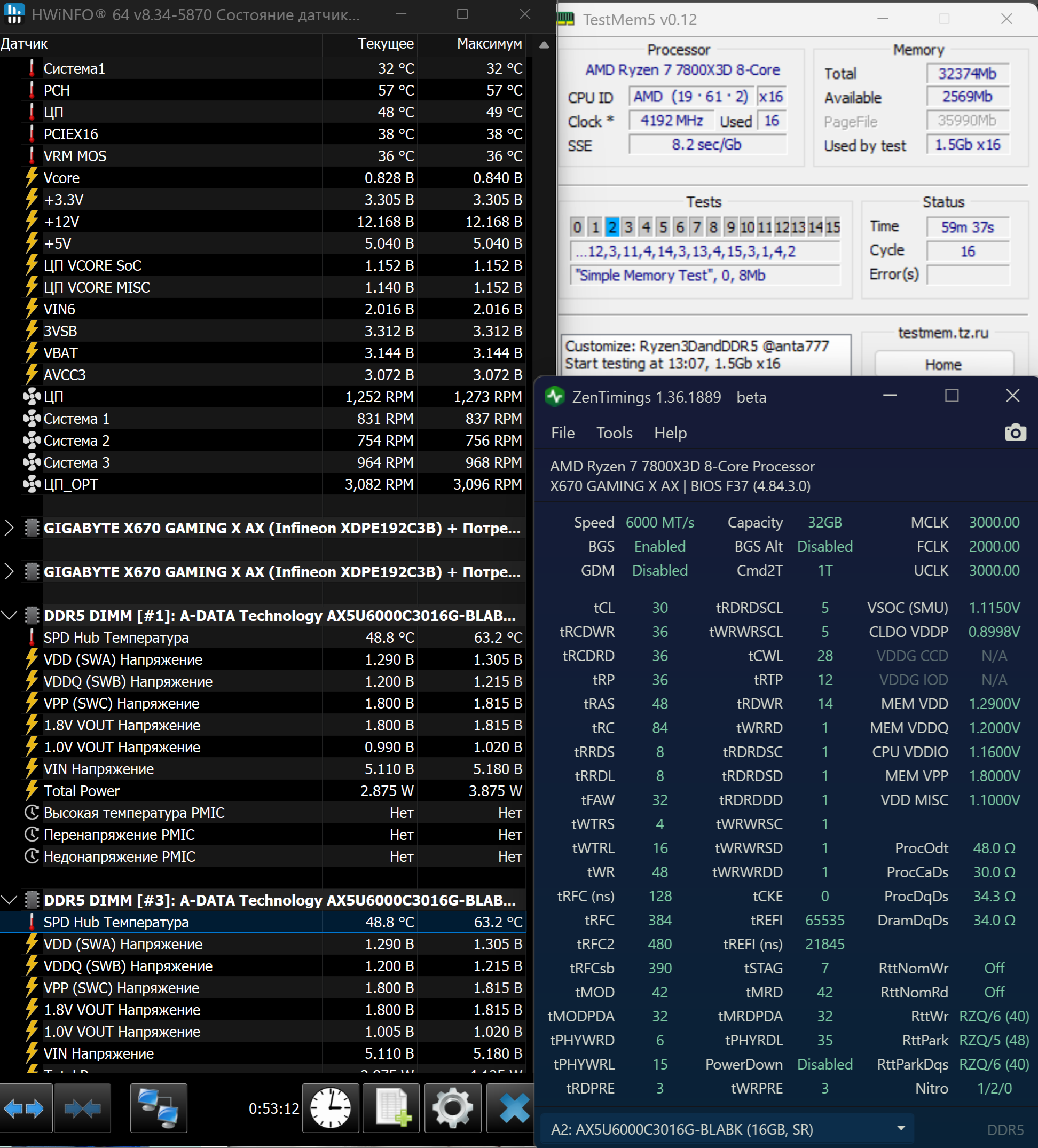 При выполнении TestMem5 с профилем Ryzen3D замечены кратковременные скачки температуры памяти до 63.2 градусов. Это какой-то глюк HW? Таких температур раньше никогда не было ни в каких играх/тестах, в районе 50 градусов обычно. Что можно посоветовать по напряжениям?