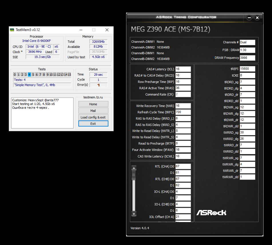 Решил поверить еще одно подозрение, выставил WPRE и RPRE на авто и оставил tRFC и tREFI тоже в авто. Сейчас уже 18 минут тест без ошибок. Есть подозрение что в них был дело