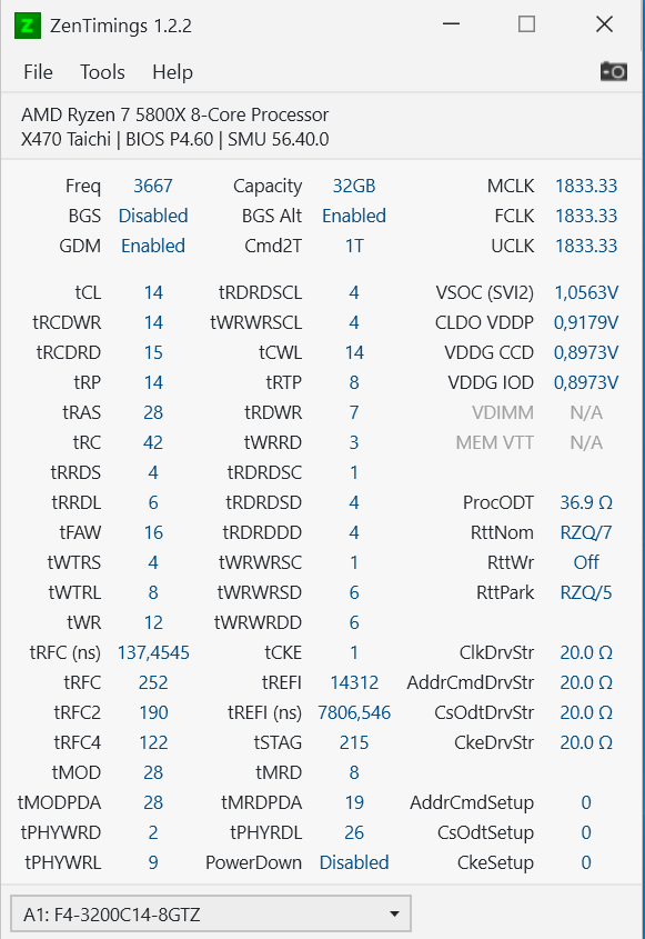 The KMS По напряжениям: vsoc 1.15, iod/ccd 1.05-1.1, vddp 1.0, vdimm 1.6. Терминацию и cadbus крутил согласно калькулятору для 4 однорангов б-дай. Ну и пробовал классические 7/3/1. Какой максимум можно ставить для clkdrvstr?