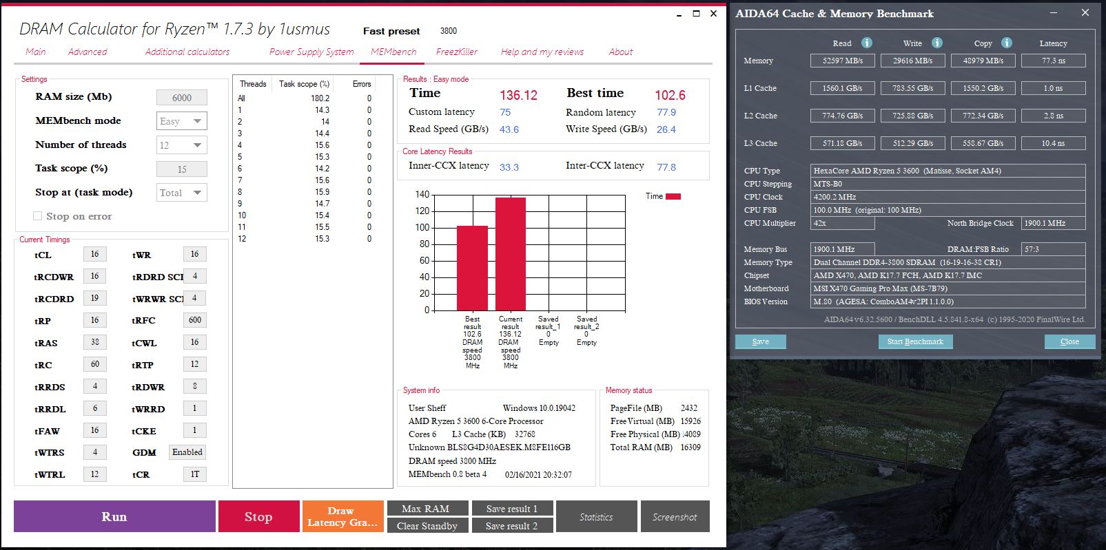 Подскажите пожалуйста по экстремальному разгону памяти: Есть комплект памяти Samsung B-Die по XMP указано 4400MHZ с 19 таймингами но с профилем XMP во всех тестах производительность сильно ниже чем текущий разгон по Ryzen DRAM Calculator, а вручную мне не удалось адекватно настроить тайминги на данной частоте. Посоветуйте пожалуйста где посмотреть тайминги для памяти с такой частотой или скиньте пожалуйста свои варианты если уже разгоняли. Текущий разгон памяти 3866 настраивал все по Ryzen DRAM Calculator кроме вольтажа DRAM(1.46v) и двух сопротивлений(поставил 60ом и 30ом чтобы убрать ошибки в мемтесте) на приложенных скриншотах.