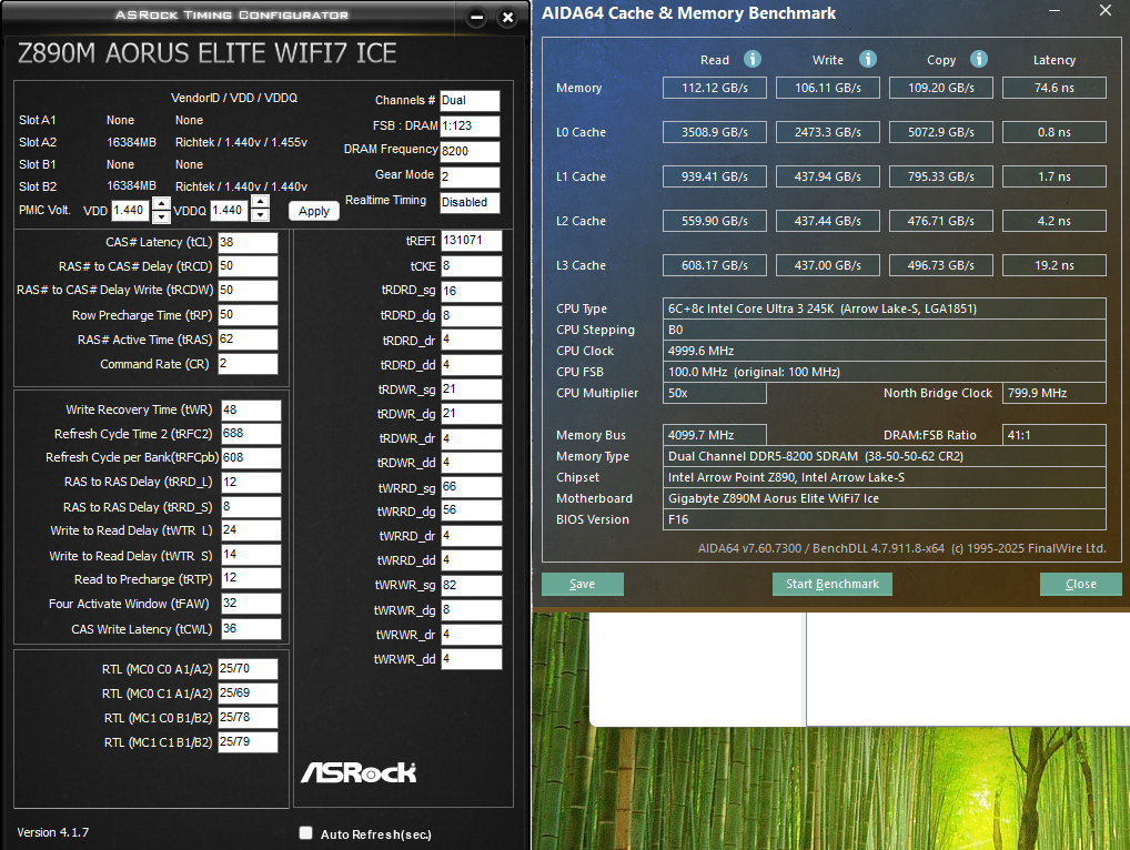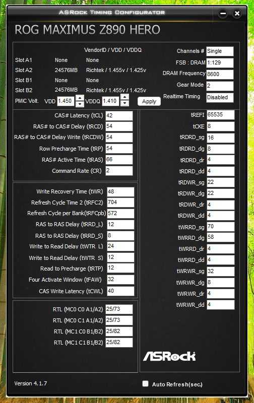 Всех приветствую! Имеется Core Ultra 245K и память TForce Xtreem 2X16 6000C30. Память решил стабилизировать на 8200, хотя едет и больше. Нужна помощь в настройке тайминга tWRWR_sg. При разгоне все ставят в пределах 16-32. Но у меня при таких таймингах режется скорость записи в два раза и скорость копирования в полтора. Материнка автоматом этот тайминг ставит в 82. С 82 всё норм. Хотя скорости в аиде немного смущают, у многих повыше. Или это CUDIMM у них так влияет? Проц, d2d, ring, ngu сбросил пока в сток. Ещё была проблема с таймингом tXP, вплоть до 14 комп не стартует, далее ошибки. В итоге оставил на 18 (материнка так ставит автоматом). WTRL и WTRS стоят в 22 и 12 соответственно, прога завысила на два пункта. И ещё, что ставить в tRFCpb?