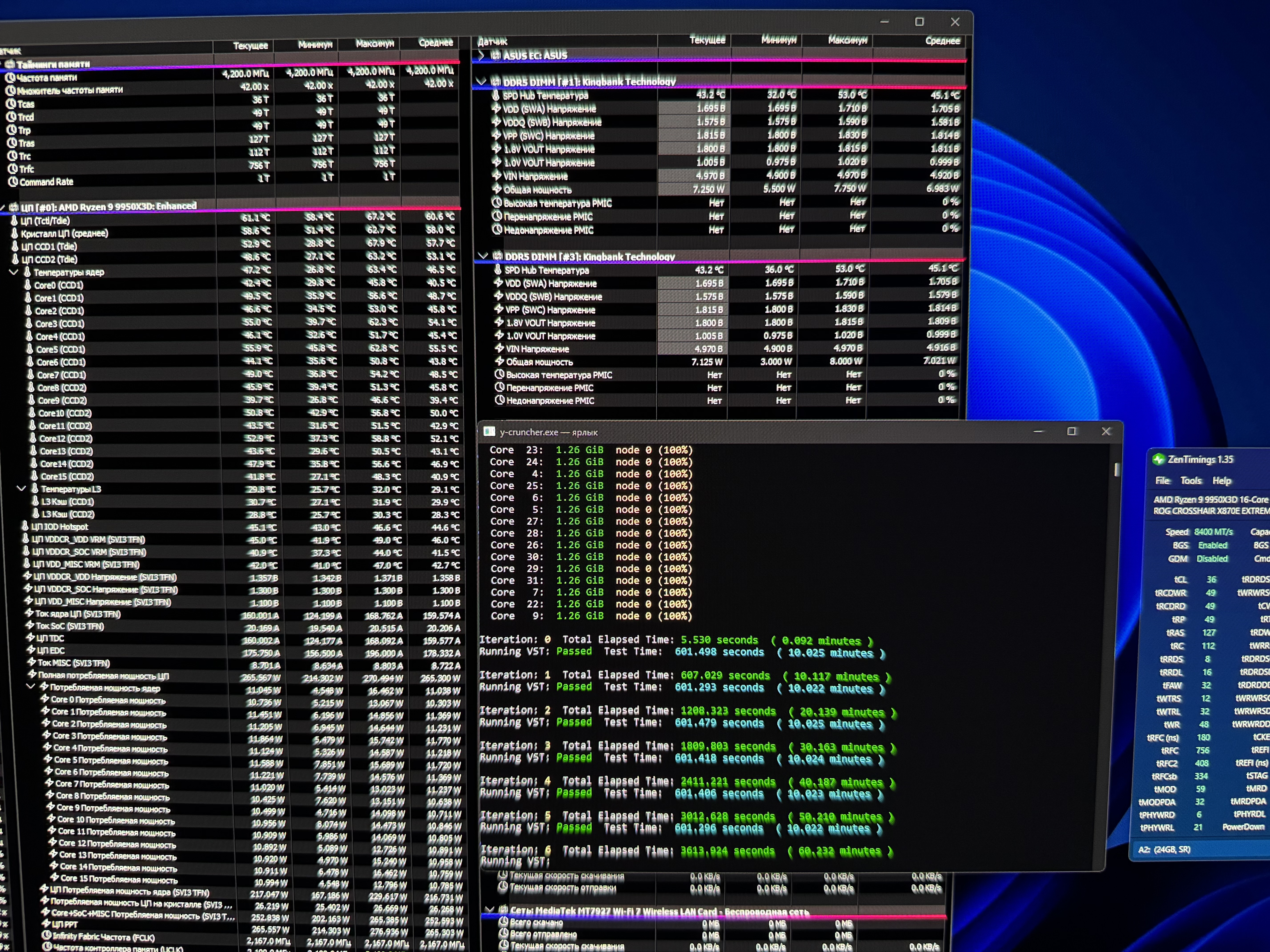 Здравствуйте. 9800x3d (pbo -35 +200mhz), Asus Tuf b850-Plus, Kingston Fury 6400MHz (KF564C32BWAK2-32). Сперва настроил тайминги и напряжения по видео Дакара на 6000/3000/2000 (ничего специально не подбирал и не выжимал), потом просто поднял частоту с этими же настройками до 6200/3100/2133. Пробовал ставить 6400/3200/2167 SOC 1.25в и сразу получаю ошибки даже в XMP (32-39-39-80, все vdd 1,4в). Подскажите имеет смысл что-то крутить еще или сильно лучше не станет? И если заставить работать с 6400/3200/2167 будет ли прирост условных 10% от текущего в таркове или забить?