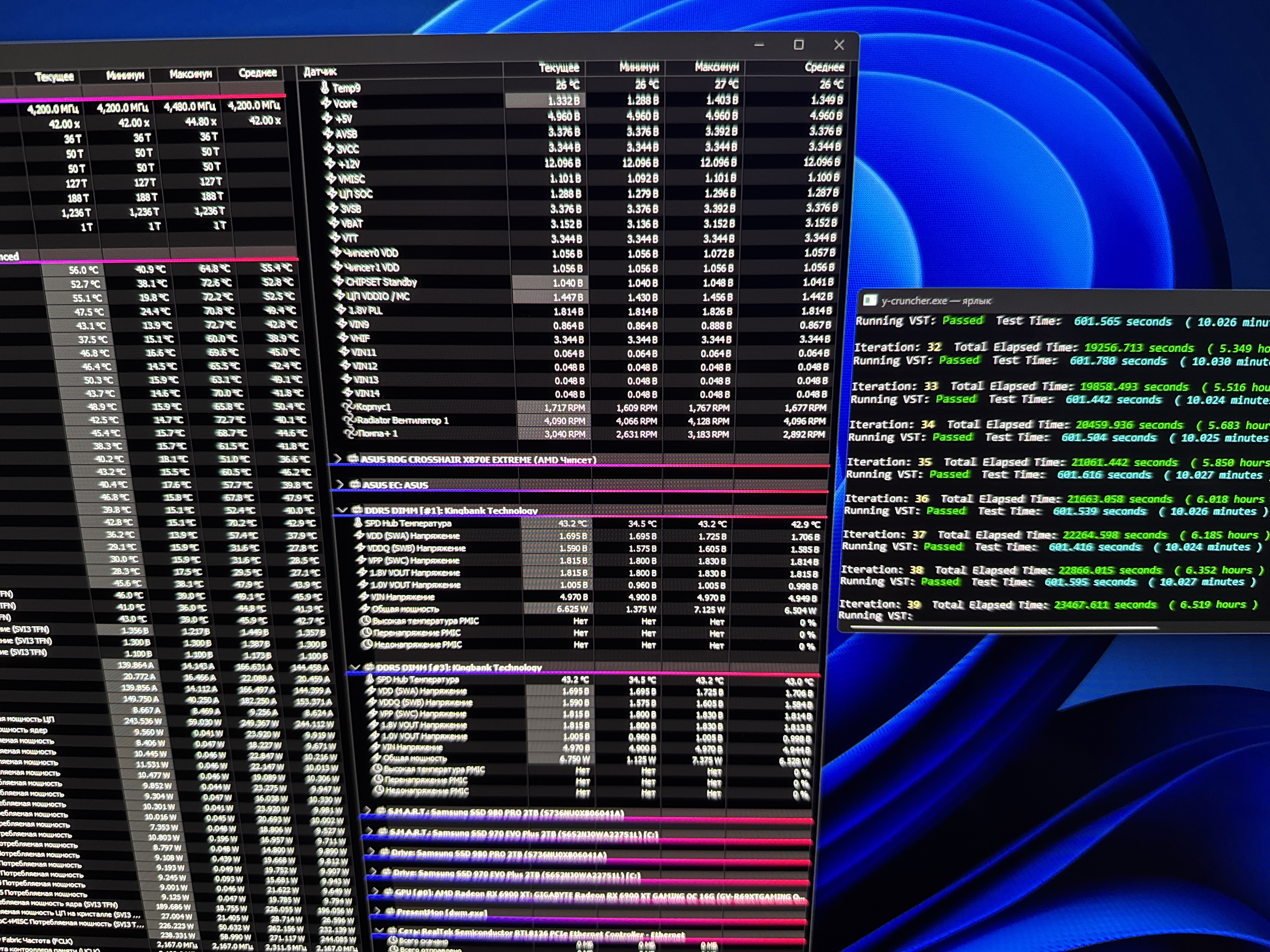 Камрады , родненькие! Неудача меня постигла. Имеем комплект Kingbank 2 x 24 за номером K5.01.FLM5NM9504 Вполне себе память по нынешним временам. Так вот у нее ЕХРО 38-52-52 и что-то там при 8400. Ну, на 8400 я не надеялся с 4 слотамина материнке (x870e crosshair hero), в 8200 был не уверен, но на 8000 рассчитывал железно. Хотя бы просто запуститься, а потом уже плясать с таймингами. А вот нет, 7800 и баста. Что я только уже не повышал - понижал , и напряжение на памяти вплоть до 1,60, короче перепробовал кучу комбинаций. А на 7800 легко грузится при SOC 1,1 на память и контроллер по 1,4. Нитро, кстати стоит 1-3-1. Power down и соntext memory выкл, встроенный гпу выкл. Проц, кстати 9800х3D. Это у меня настолько неудачный аонтроллер памяти у проца попался , или руки кривые ? Я конечно не Дебауэр, или бульдозер , но 25 лет плюс минус пон мал что делать после курения факов и мануалов. Есть шанс завестись на 8000 , или от 7800 плясать уже ?