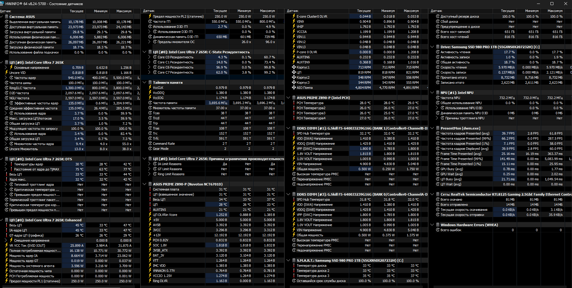 Denis_2_1 У меня практически тоже самое получилось на 14700к , Asus Strix B760 F , Xpg Lancer blade 6400... На 6800 32-39-39-51 бегает при 1.4в , SA 1.2 ,cpu vddq 1.2 , vdd2 1.316. На 7200 34-44-44-56 проходит TM5 экстрим , хоть сутками , а в ОССТ память+ЦП сыпет ошибки. Крутил тайминги, крутил напряжение, так и не смог заставить... Запускается и на 7400, ТМ5 вроде бегает , а ОССТ прям моментально сыпет...