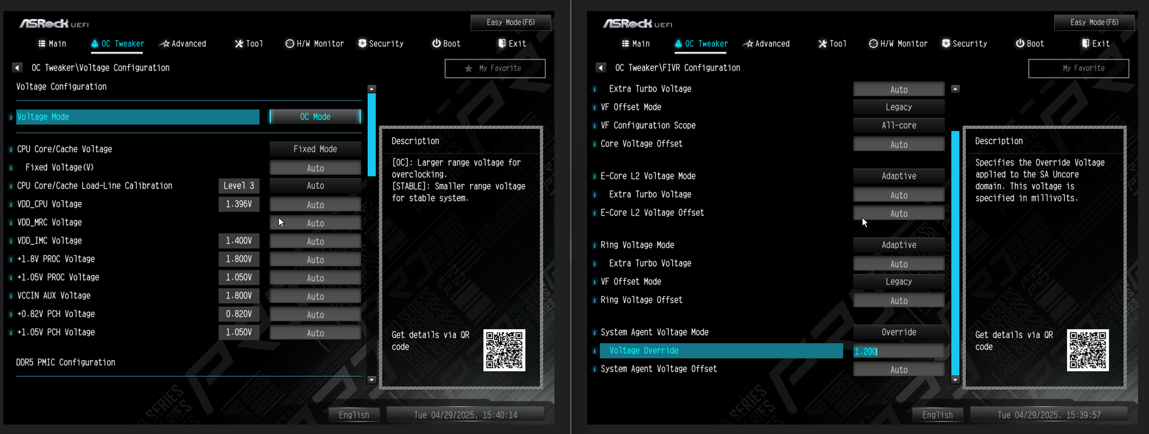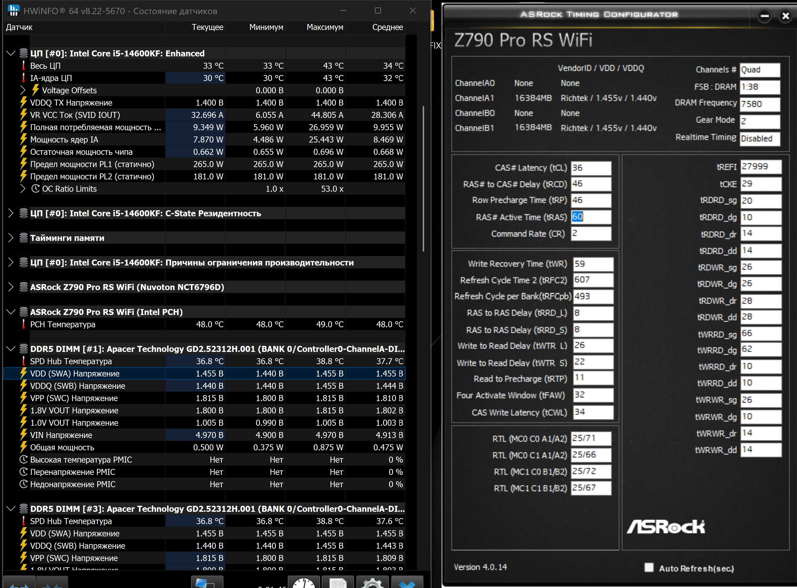 Такая вот проблемка, Apacer 7200 34-42-42-84 (xmp 1.45mv hynix), тайминги отстроил все, тесты прошел с trefi 131071. Решил разогнать, частоту 7600 взял 36-46-46-60 и тесты ок, Sa 1.2, vdd\q 1.45\1.43, vpp 1.815, однако trefi при тестах у меня стоял 27999. Как только я выставляю 131071 начинают сыпать в мем5 ошибки (пол дня уже мучаюсь). Пробовал выставить только первички, остальное в авто и менял только трефи, 1-3 ошибки в мем5 появляются. Если выставить 65535 то тесты проходят, однако профита соответственно 0, т.к. пропускная способность сильно падает и проще остаться на 7200. Подскажите, может мне нужно по напряжению что то поменять, я первый раз работаю с z790 и проц еще не настраивал, работает из коробки. Скрины прилагаю, 1 это когда тесты проходят с трефи 27000, 2-4 настройки напруги биоса!