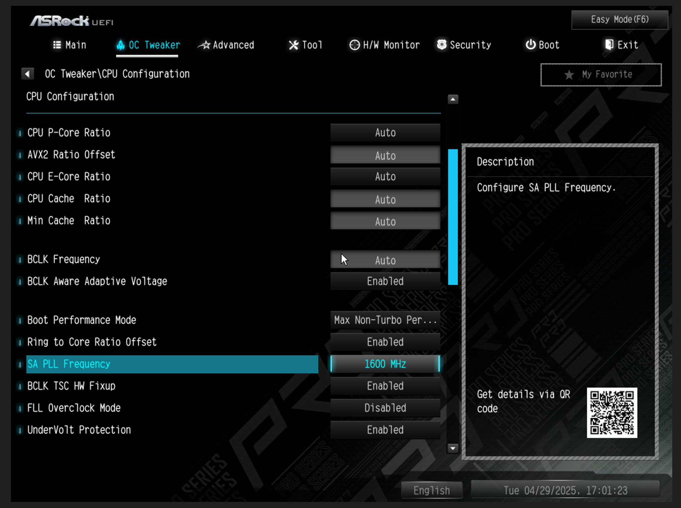 И еще один момент, в настройках ЦП есть рункт SA PLL, там можно выставить 3200мгц, 1600 и авто, какая частота предпочтительнее для разгона памяти? (скрин есть)
