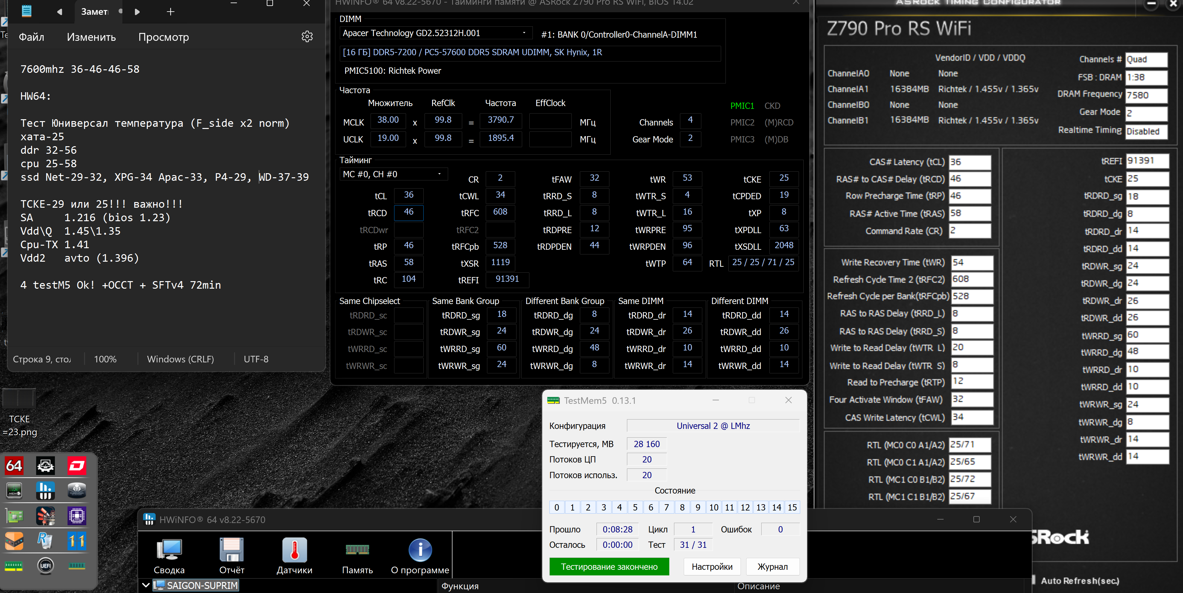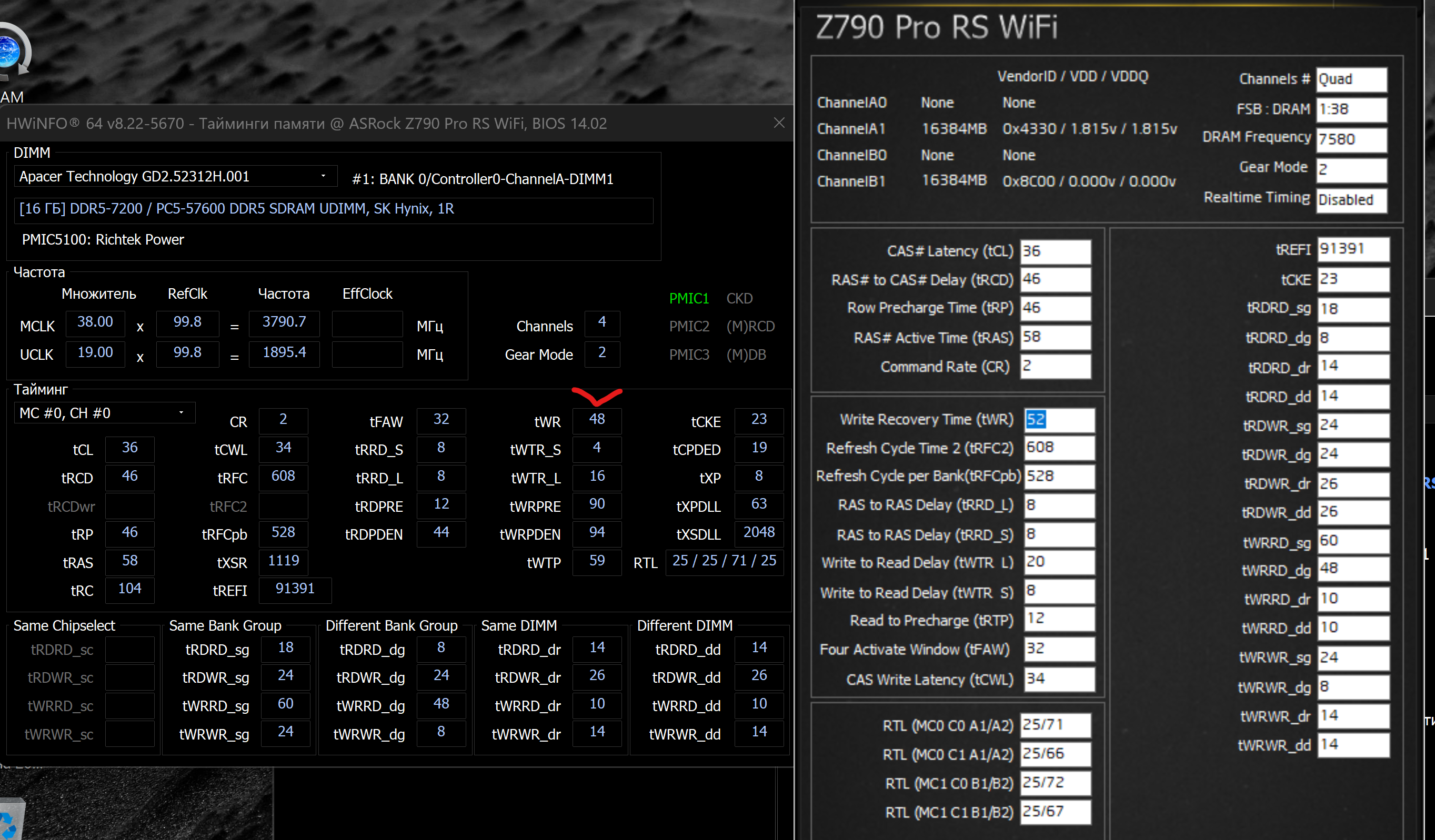 Я выставляю в биосе четный twr, например 48, а связанные тайминги в авто. АсрокКонфиг в винде показывает twr48, однако Hw64 показывает 47 и вышеуказанные тайминги (если считать по формулам) такиеже как для twr47. В самом биосе если проверить, то twr стоит 48, но связанные в авто выставляются как для 47.Также tRDPDEN ставится обязательно мат.платой =CL+8 (а не 9)=44, у меня Cl 36. При таком варианте проходят тесты Юниверсал2, Анта лайт и Sft4, другие не пробовал Аналогично на twr54(в биосе), по факту 53. Если же я выставляю twr например, 48 или выше четным, и настраиваю руками все связанные t по формулам, т.е. tRDPDEN=CL+9=45 и т.д., ни один тест не проходит!