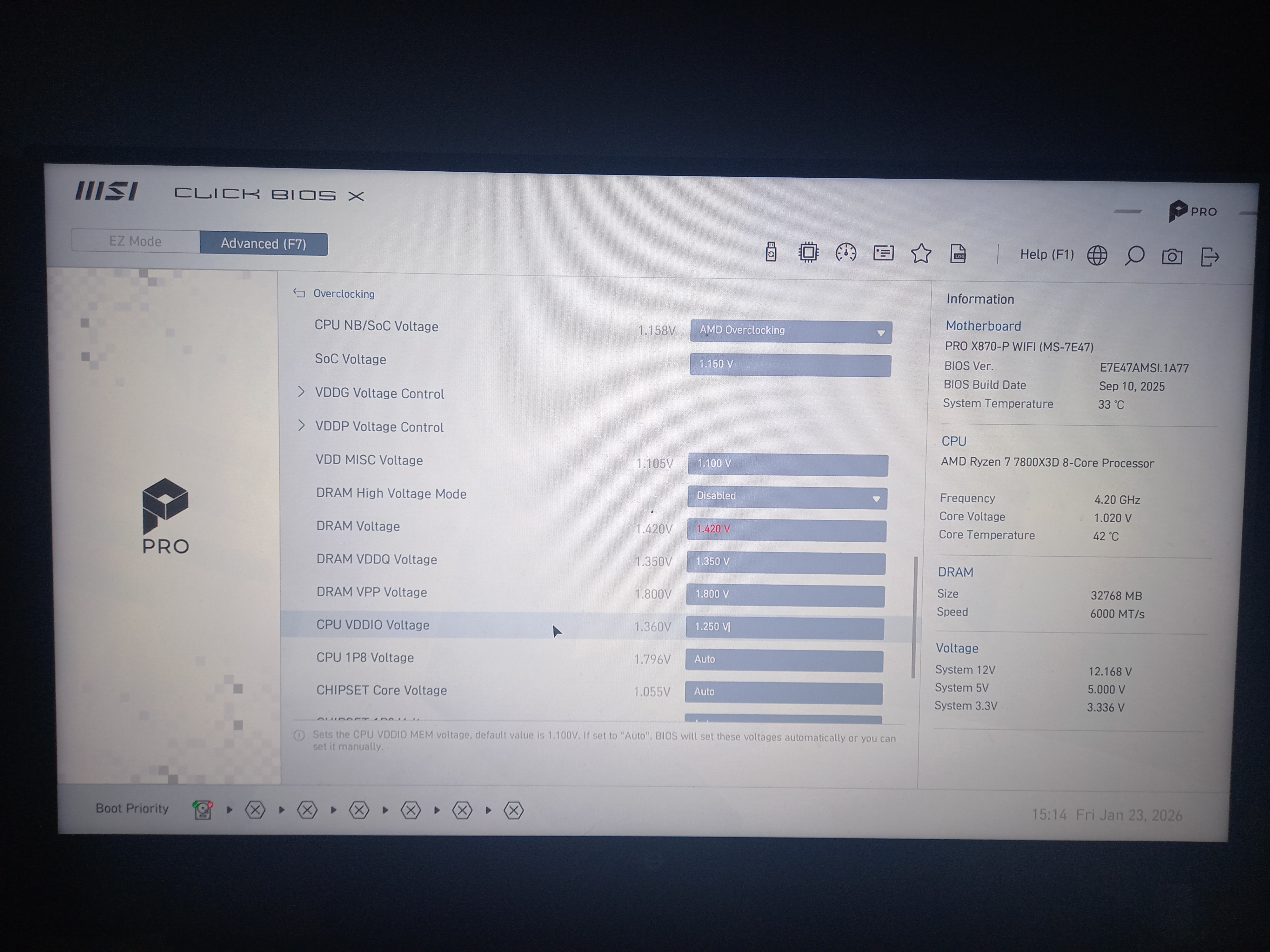 1. По какой-то причине вручную выставленный в Bios вольтаж для CPU VDDIO например 1.250 после перезагрузки ПК всё равно показывает в Bios 1.360V и при этом в HWInfo и Aida64 тоже показывает 1.360V. То есть в Bios вручную выставлен вольтаж для CPU VDDIO, однако после перезагрузки ПК он показывается будто бы он выставлен в Auto с вольтажом 1.360V, но при этом вручную был выставлен в биосе вольтаж CPU VDDIO 1.250V, что странно. При этом для мат. платы MSI PRO X870-P WIFI Bios стоит AMI BIOS 7E47v1A77 2025-09-11 (https://ru.msi.com/Motherboard/PRO-X870-P-WIFI/support), который был обновлён как раз в сентябре 2025 года, а данную особенность заметил только сейчас. При этом все остальные выставленные вручную вольтажи показываются в Bios, HWInfo и Aida64 как положенно, а вот выставленный вручную вольтаж VDDIO 1.250V показывается будто бы он стоит в значении 1.360V (этот вольтаж показывается если стоит значение Auto), но вольтаж же был для VDDIO выставлен вручную со значением 1.250V. Также попробовал поставить для VDDIO вольтаж 1.200 и всё равно показывает 1.360V. Что это за странность такая?