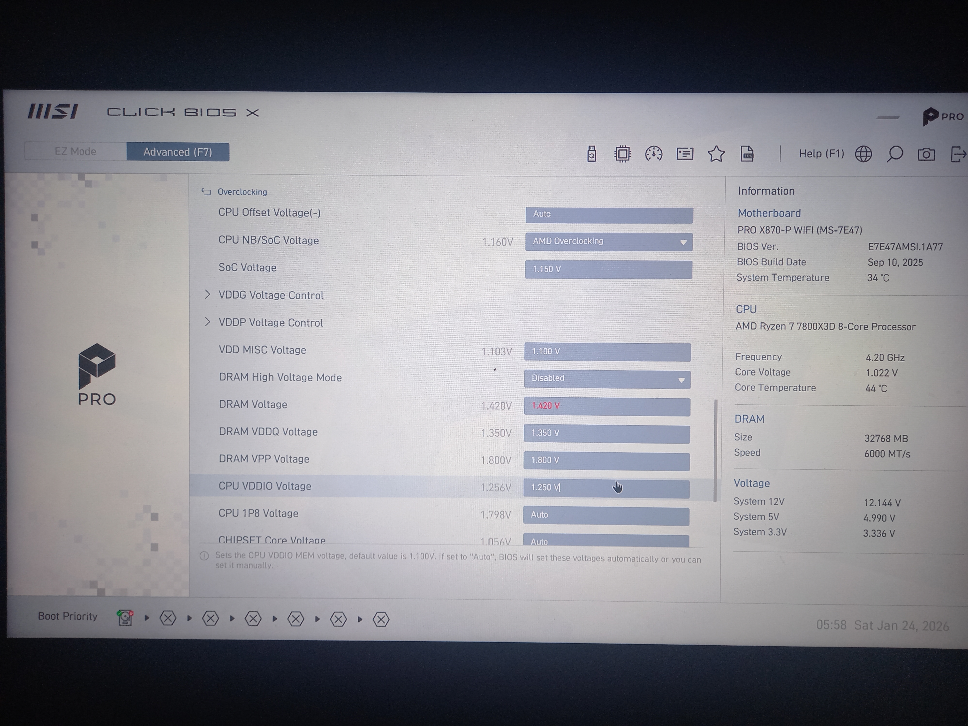 Лично мне помог только сброс биоса на дефолт профиль и заново пришлось в биосе выставлять все настройки из ранее записанного на телефоне бэкап-видео настроек биоса перед сбросом биоса на профиль по умолчанию (F6). При этом если после сброса на дефолт нажать на F8 и выбрать свой бэкап-профиль со всеми своими настройками и перезагрузить ПК, то баг выставленного вручную вольтажа для VDDIO снова может проявиться, что странно, поэтому пришлось после сброса биоса на дефолт выставить вручную и записать на F9 новый профиль и после этого баг перестал проявляться. Странный баг биоса выставленного вручную вольтажа для VDDIO, который вынуждает применить профиль по умолчавнию и заново вручную ставить все настройки, о чём ниже некоторые нейронки тоже написали о таком баге разных версий биосов различных вендоров.