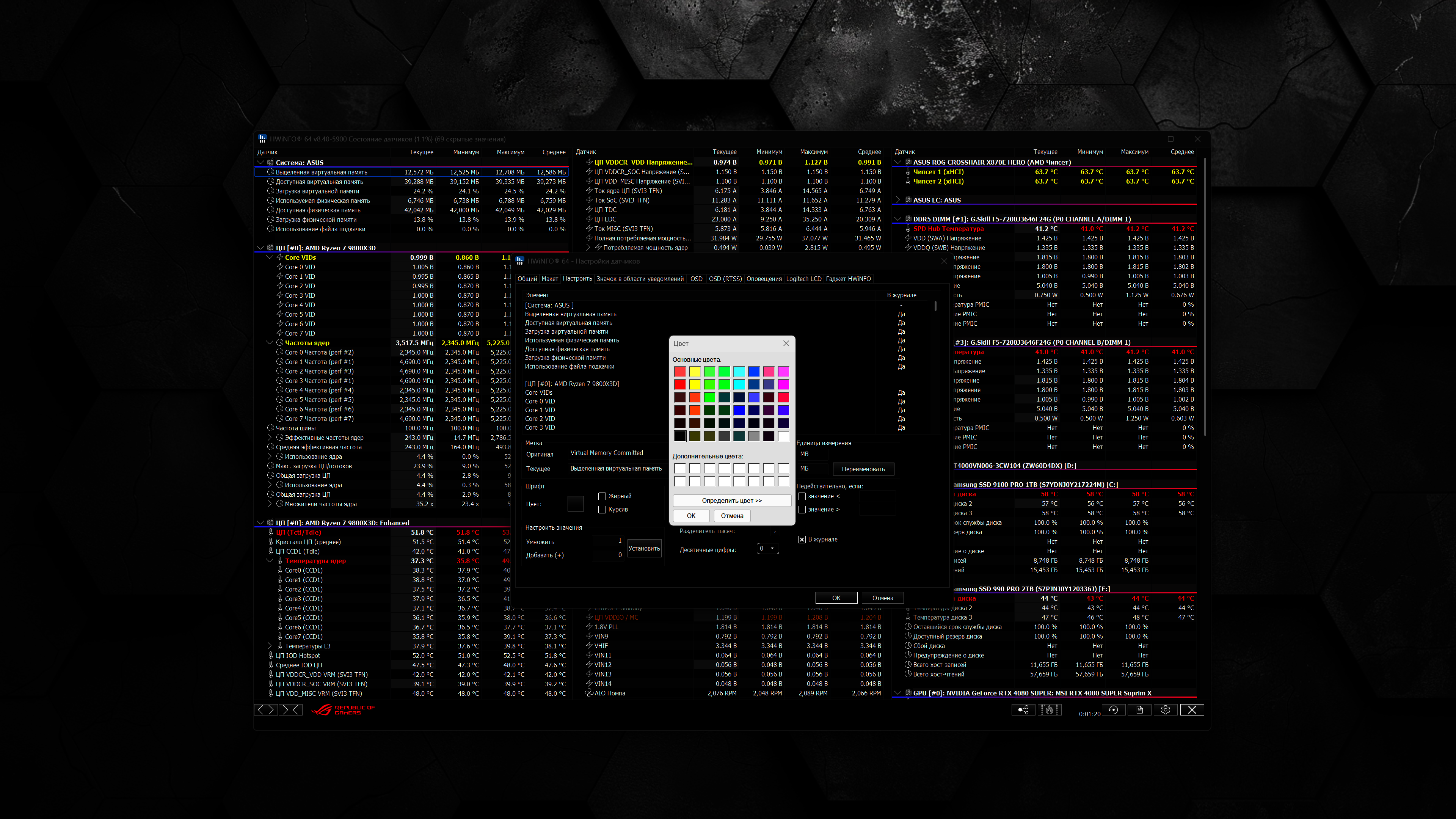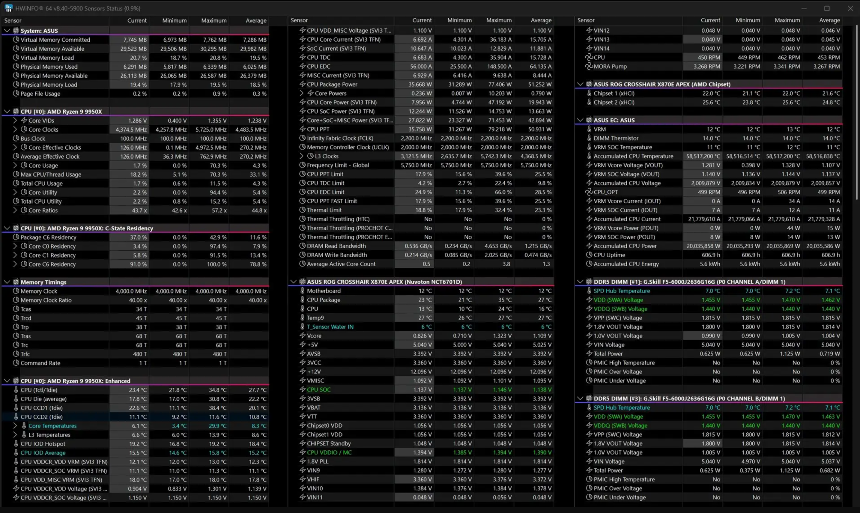 Напомню, что у меня 9950x3d, strix b850-e, 5080. По памяти основное: - 2х48 (96гб) - 2хDR - 24gbit hynix m die - и вся заварушка с настройками при 1.35В на VDD/Q/IO Продуваемость хорошая, 6х140 винтов на вдув, 1х120 на выдув и 3х14 от водянки на выдув. (6х montech rx140, 1х montech ax120, 3х arctic p14 pro на воде freezer 420) У первых семи в районе 900-950 оборотов, у арктиков точно не помню, но тоже приемлимо и бесшумно. В целом температурки внутри очень маленькие, у памяти около 39 помню видел, плюс всегда можно выключить подсветку, что даст еще -3-5 градусов.