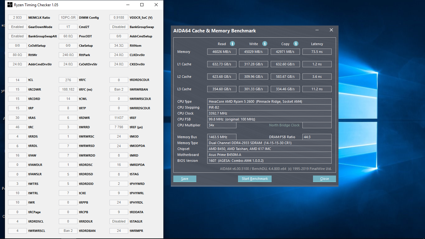 Наконец-то мне удалось стабилизировать эту долбаную память Patriot Viper 4 pv48g300c6k на частоте 2933 Мгц, сделанную на проклятых чипах B-Die от Hynix H5AN4G8NBJR-TFC. Боролся с этой памятью с Нового года, удалось достичь только стабильных 2800 Мгц. Чего я только с ней не делал, и местами менял, и слоты разные пробовал, перебрал все тайминги и сопротивления ProcODT/Rtt/CadBus. Не помогало ничего. 2800 и хоть ты тресни! Уже руки опустились... И тут, 10 мая захожу на сайт Asus, и вижу новый биос для моей платы Prime B450M-A версии 1201 (A.G.E.S.A. 0072a). Недолго думая обновился и решил еще разок проверить частоту 2933. Ryzen DRAM Calculator в помощь (спасибо 1usmus'у за его труды). Взял 2933 Мгц с таймингами 14-16-16-34, правда сопротивления Rtt (Off/Rzq3/Rzq1) пришлось выставить как у двуранга, почему так произошло понять не могу. Память одноранговая. Скрины ниже.