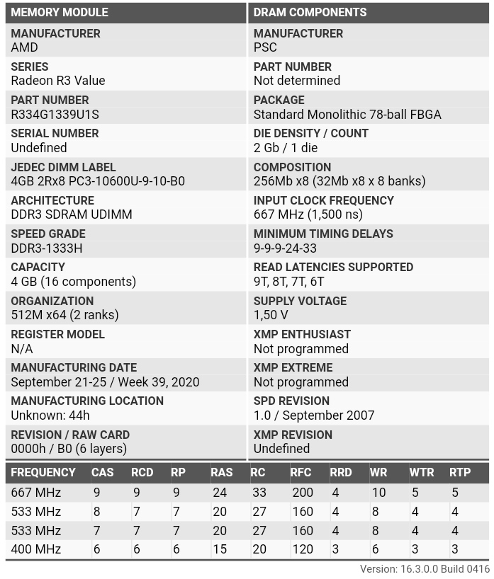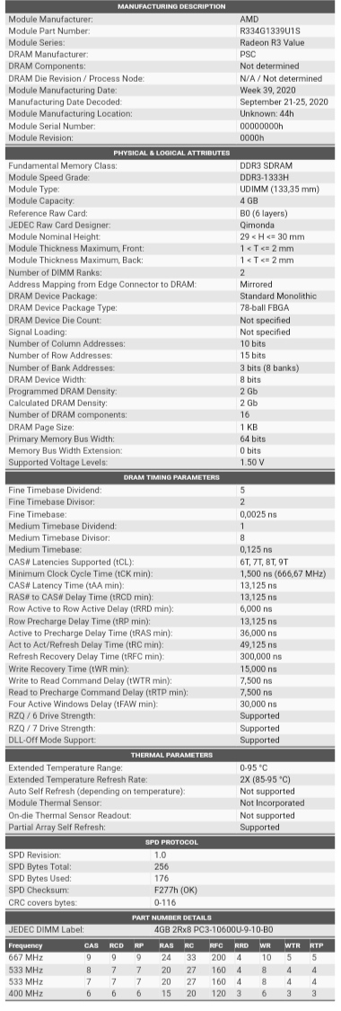 Помогите найти ошибку в СПД ПК не загружается, даже пост коды. Подозрение вызывает параметр RFC в тайминнах. А возможно и организация чипов другая. Может кто сталкивался с такой памятью. планка AMD R334G1339U1S-U 4GB ddr3 1333MHz (9-9-9-24) 1.5v чипы памяти AMD 23ey4587mb3h 200923AP